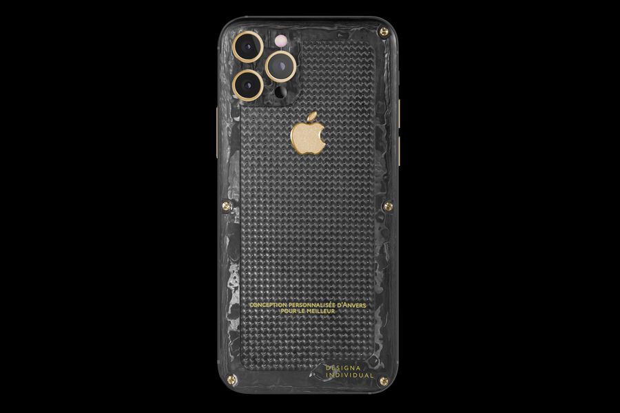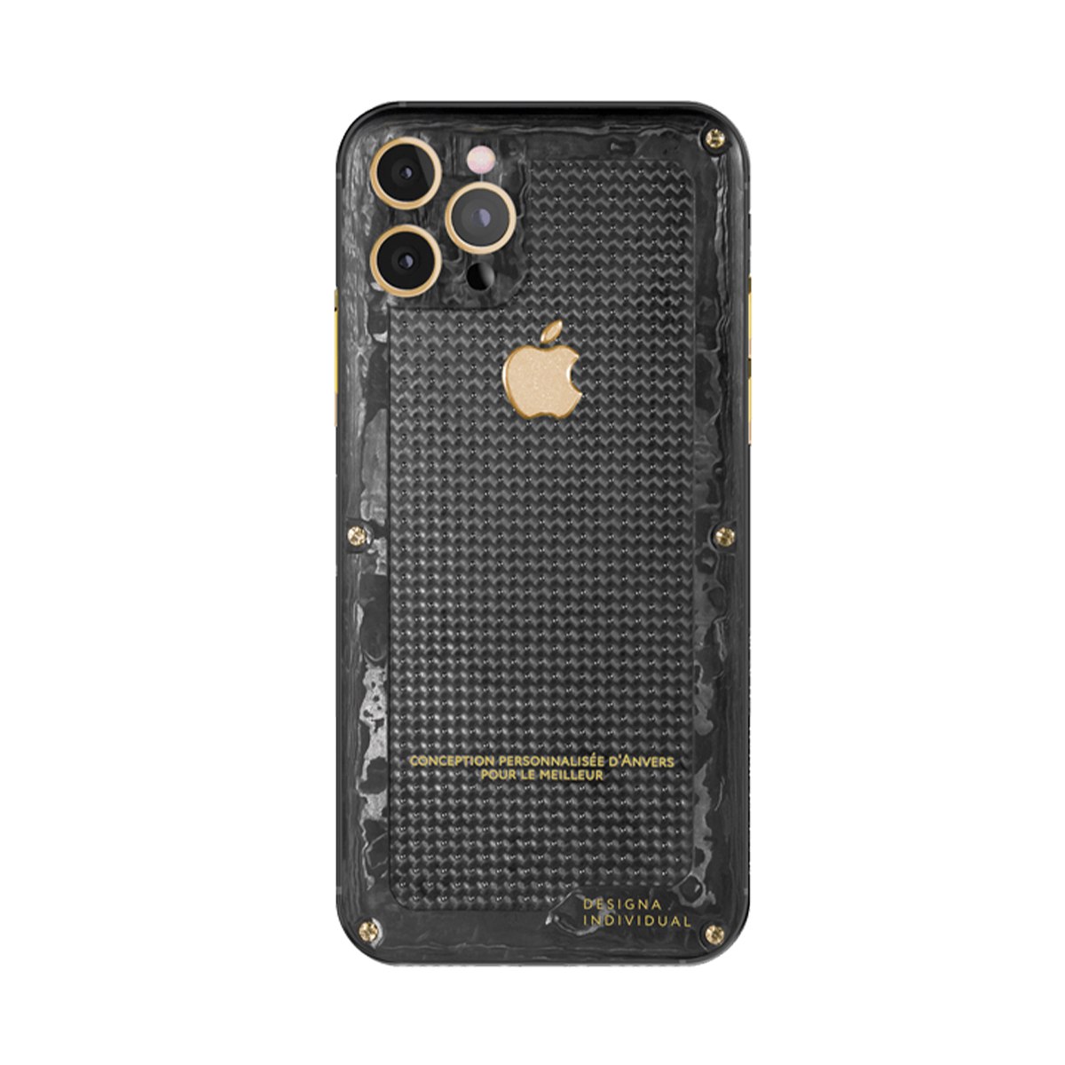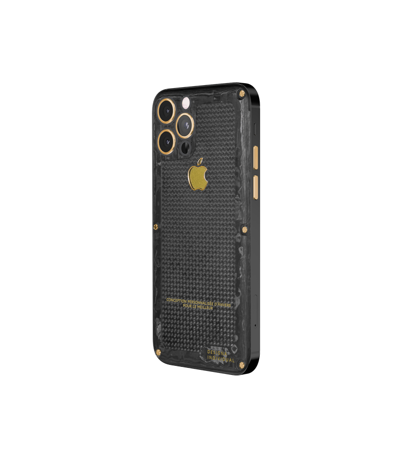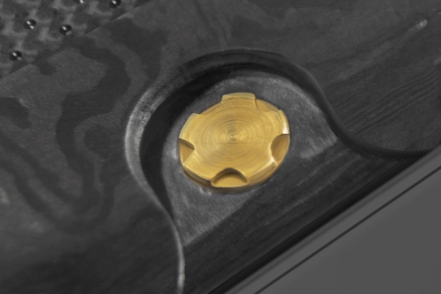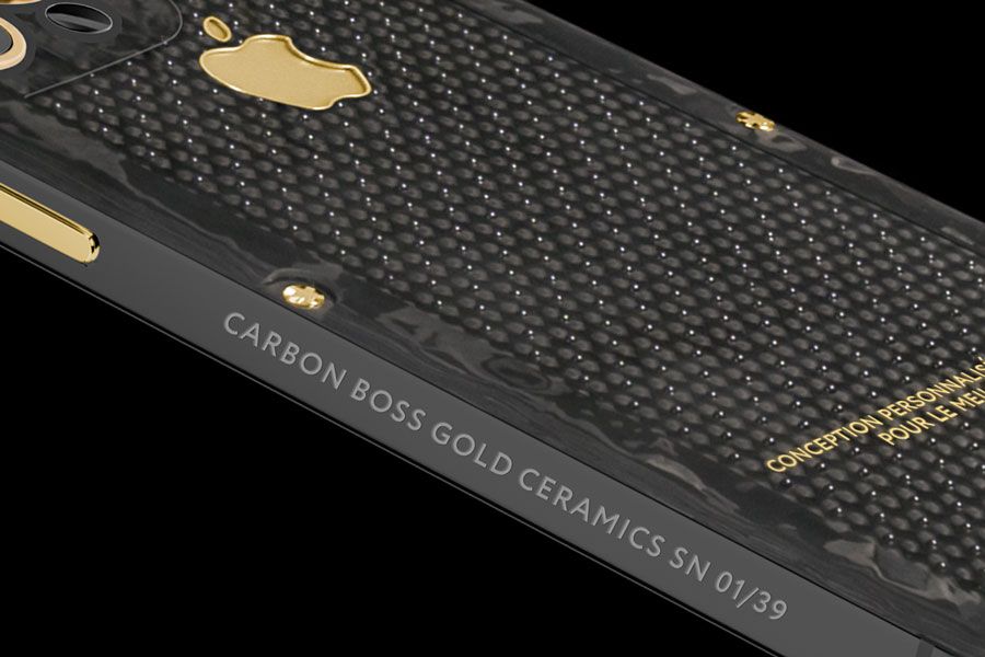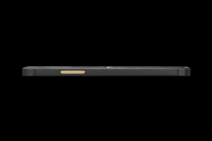 Заднаяя панель Два вида высококачественного карбона. Классическое матовое углеродное волокно переплетается с текстурой дамасской стали. Окантовка вокруг камеры и болтов выполнена из 18-каратного золота