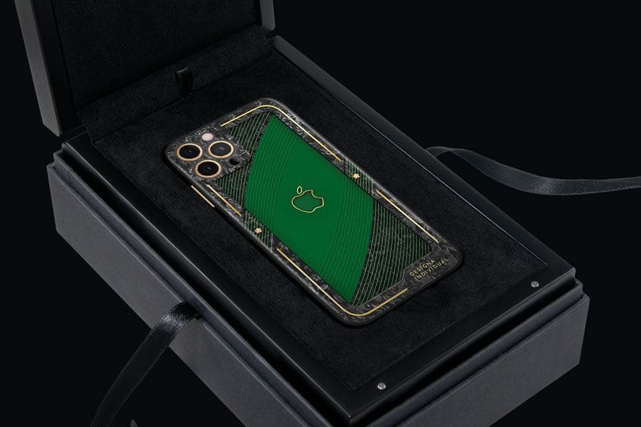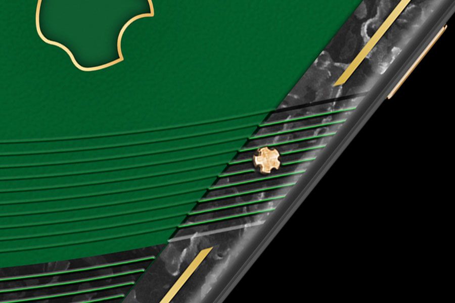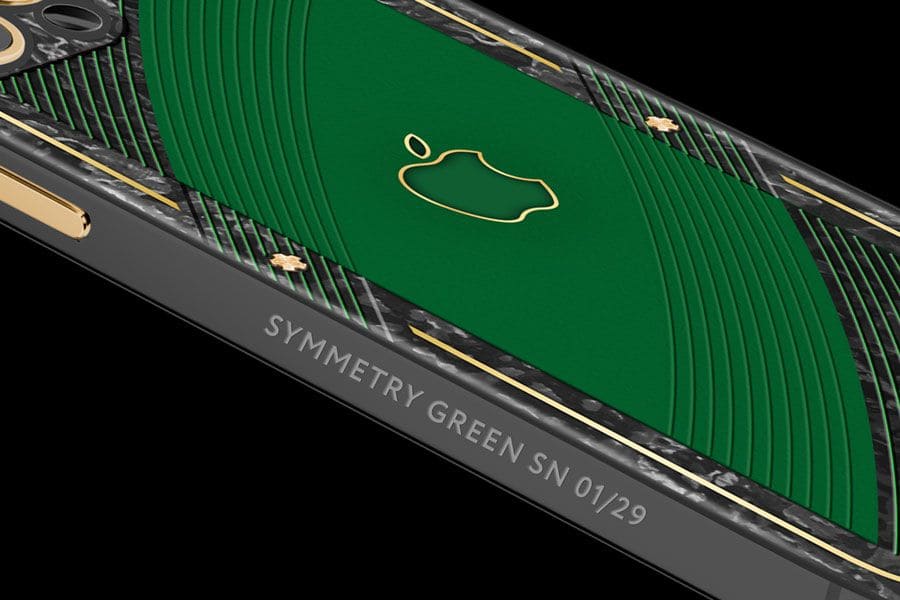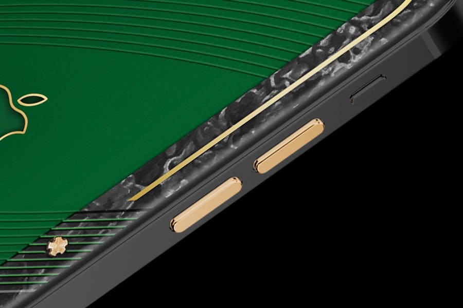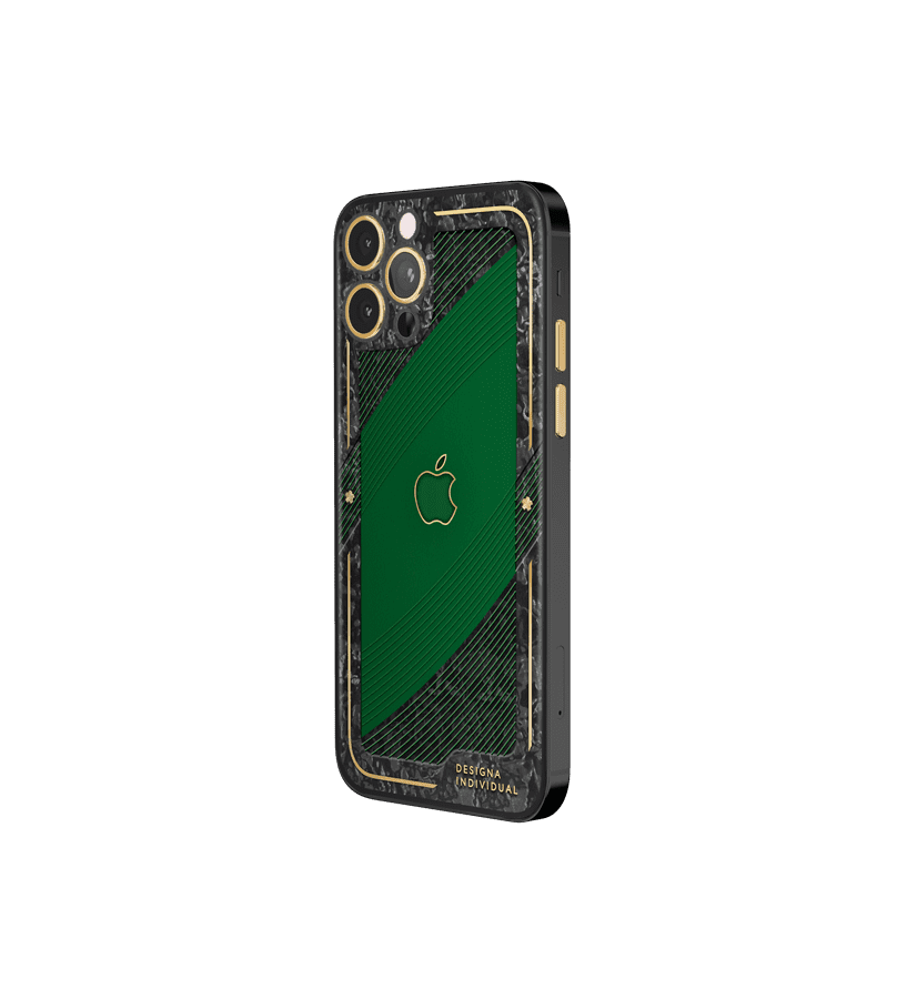 Заднаяя панель Высококачественное углеродное волокно с 2 различными текстурами. Окантовка вокруг камеры и болты выполнены из 18-каратного золота