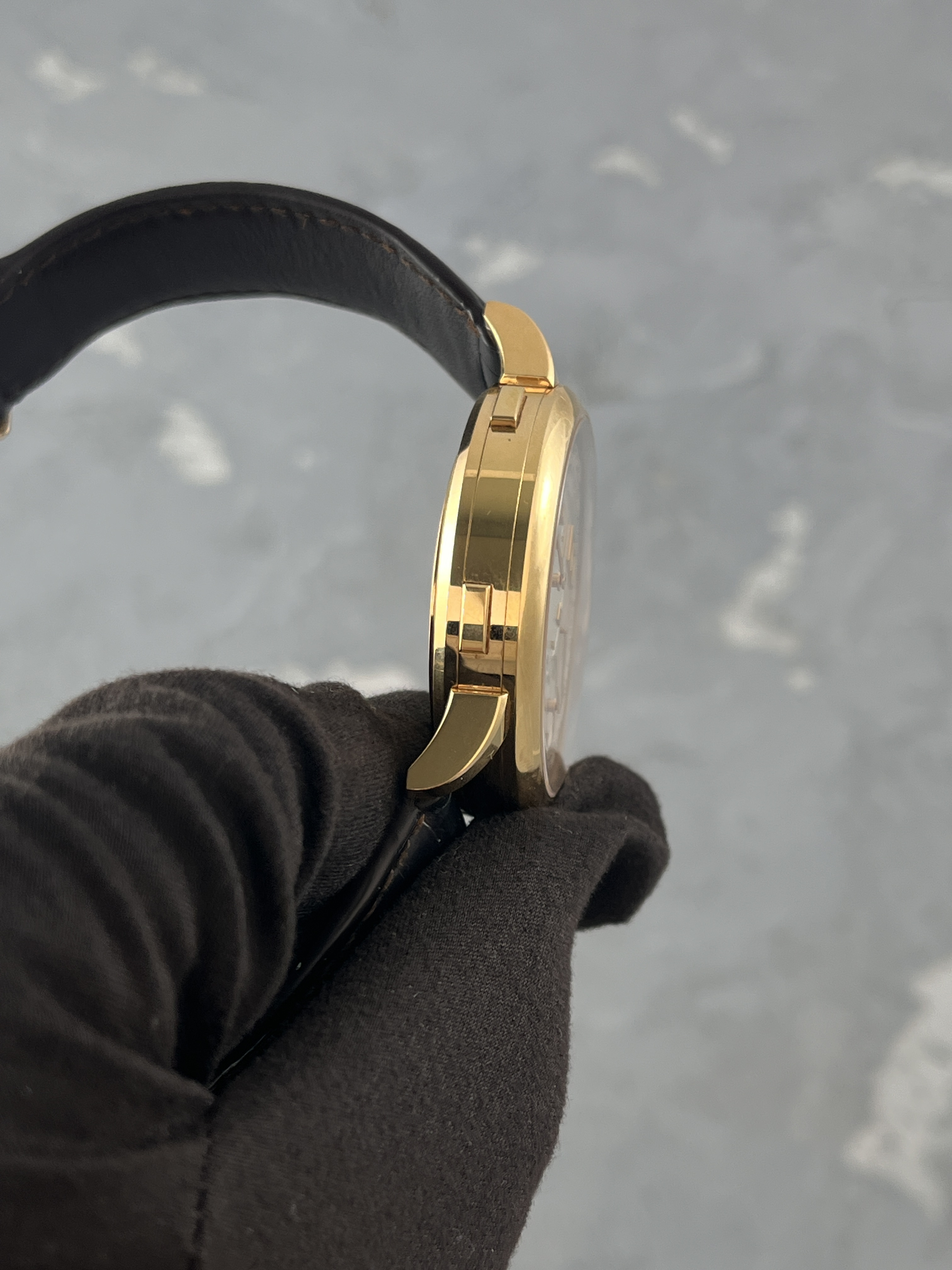 Эти мужские часы, выполненные из роскошного розового золота, поражают своей элегантностью и изысканностью. Корпус диаметром 42 мм гармонично сочетается с кожаным ремешком, создавая образ совершенного стиля и утонченного вкуса. Сапфировое стекло обеспечивает идеальную видимость всех деталей механизма, а также защищает часы от воздействия внешних факторов.