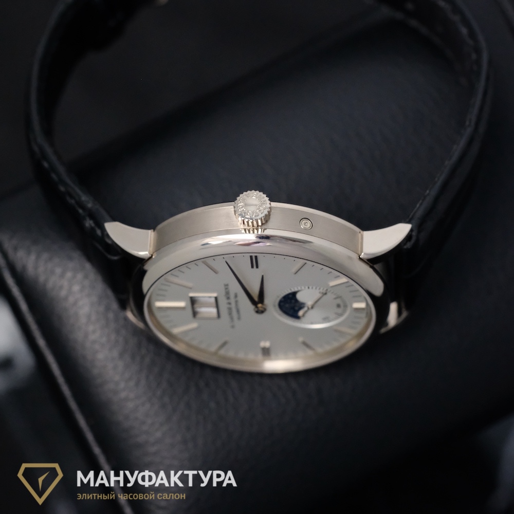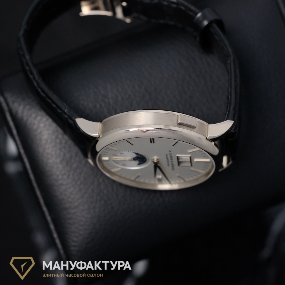 Часы SAXONIA MOON PHASE с увеличенной датой Lange и точным отображением фазы луны сочетают в себе два классических усложнения. Версия модели из белого золота украшена циферблатом цвета аржантеи, изготовленным из цельного серебра.