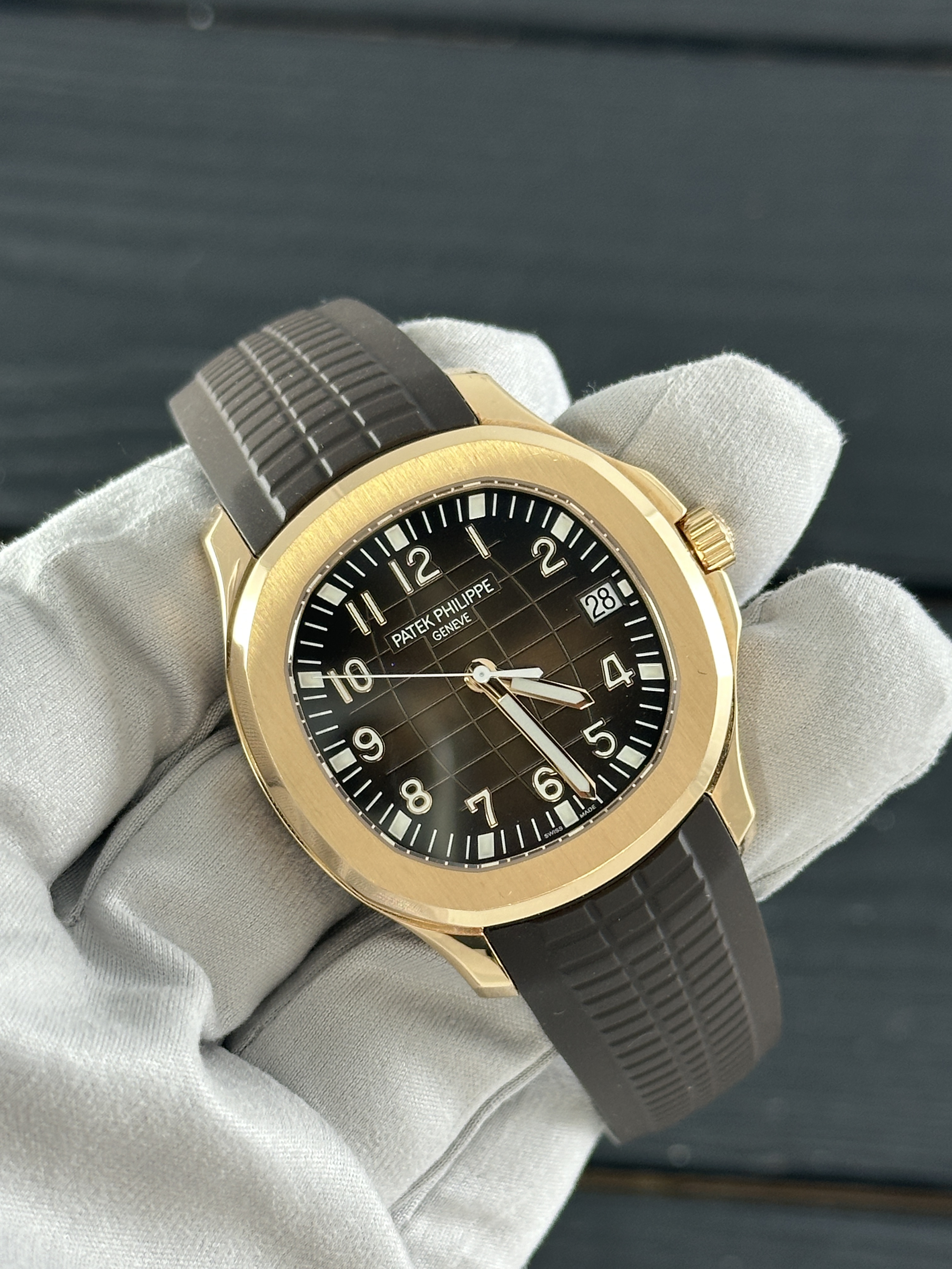 Вашему вниманию предлагается эксклюзивный шедевр швейцарского часового искусства – Aquanaut Rose Gold от легендарного бренда Patek Philippe. Этот уникальный экземпляр, обозначенный как 5167R-001, станет идеальным аксессуаром для истинного ценителя роскоши и стиля.