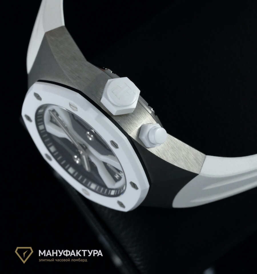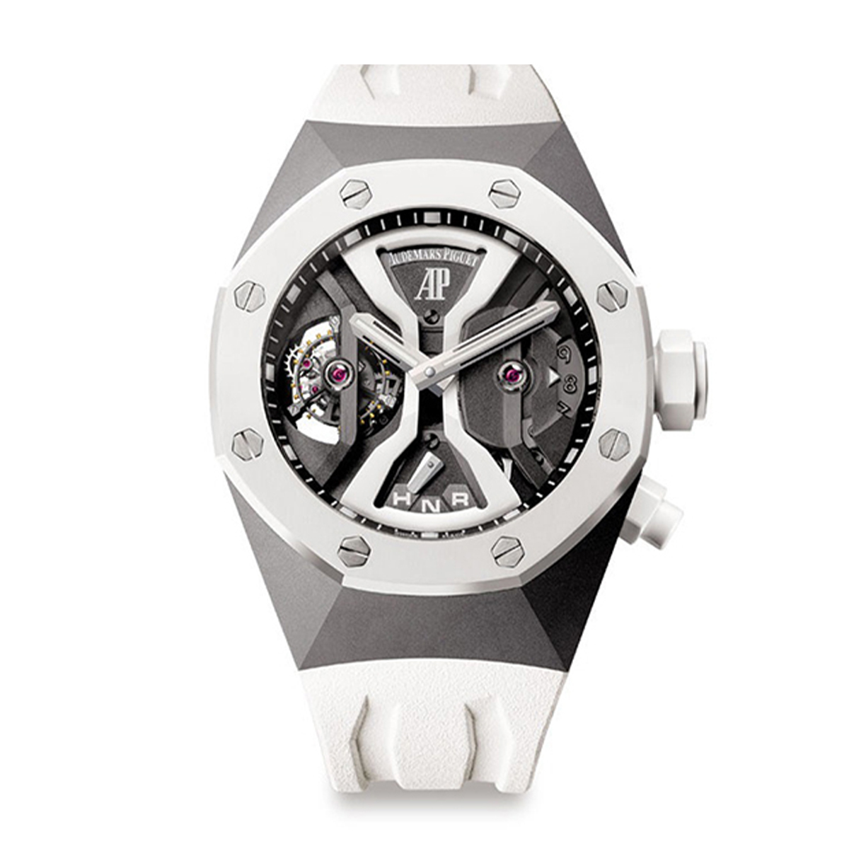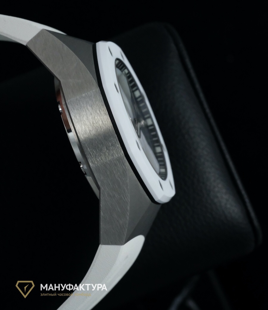 Корпус из керамики размером 44 мм выглядит мощным и стильным, а ремешок из каучука обеспечивает комфортное ношение. Сапфировое стекло позволяет насладиться изысканными деталями механизма, включая турбийон – одно из самых сложных и красивых украшений в часовой механике.