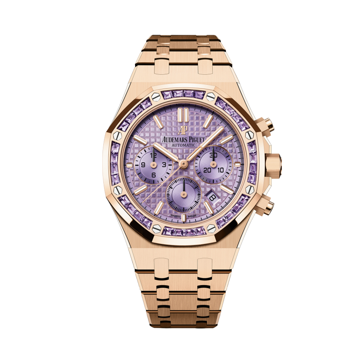 Эти часы – настоящий шедевр, выполненный из розового золота 750-й пробы, что придает им особую роскошь и изысканность. Браслет, выполненный из того же материала, гармонично дополняет корпус, создавая ощущение непрерывности и целостности. Но главное украшение этих часов – это безель, декорированный 32 аметистами багетной огранки, которые добавляют часам дополнительный блеск и изящество.