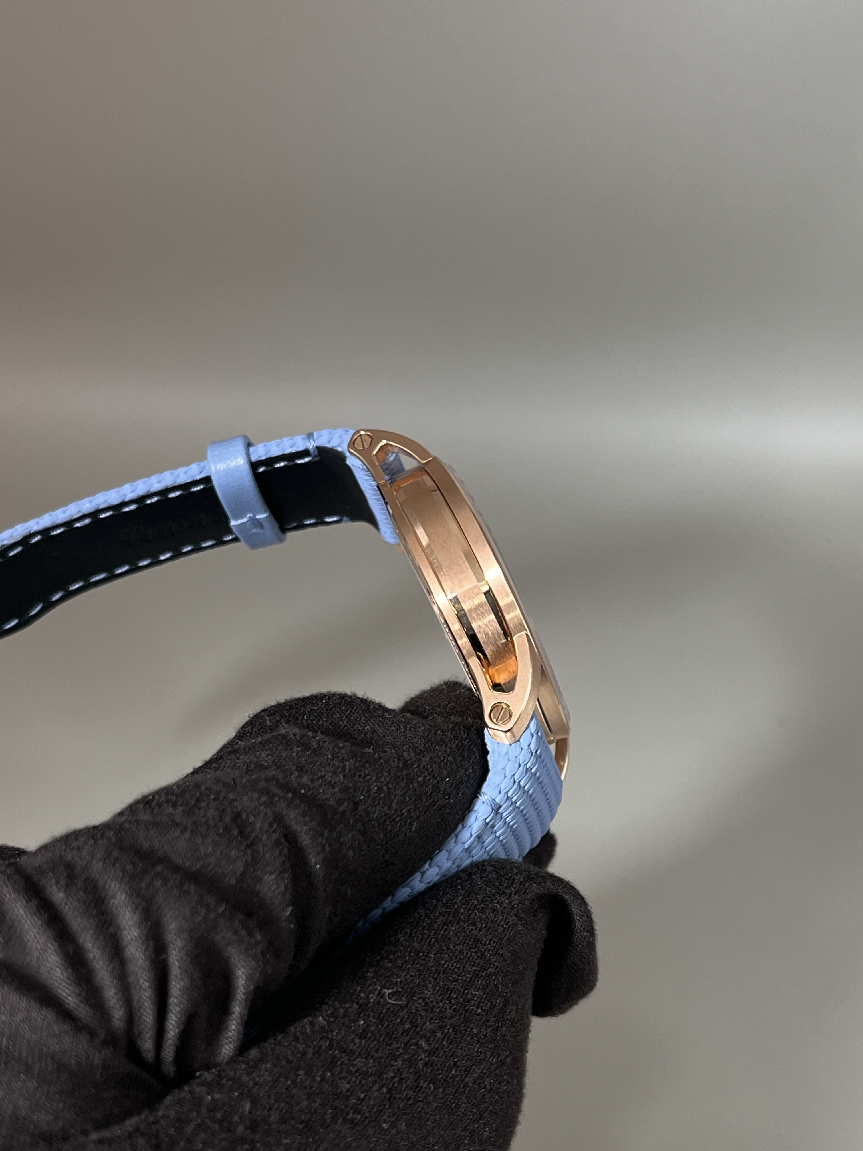 Корпус часов изготовлен из роскошного розового золота, что придает им особую элегантность и статусность. Сапфировое стекло обеспечивает идеальную видимость деталей механизма, а также защищает часы от повреждений. Размер корпуса составляет 38 мм, что делает его универсальным выбором как для мужчин, так и для женщин.
