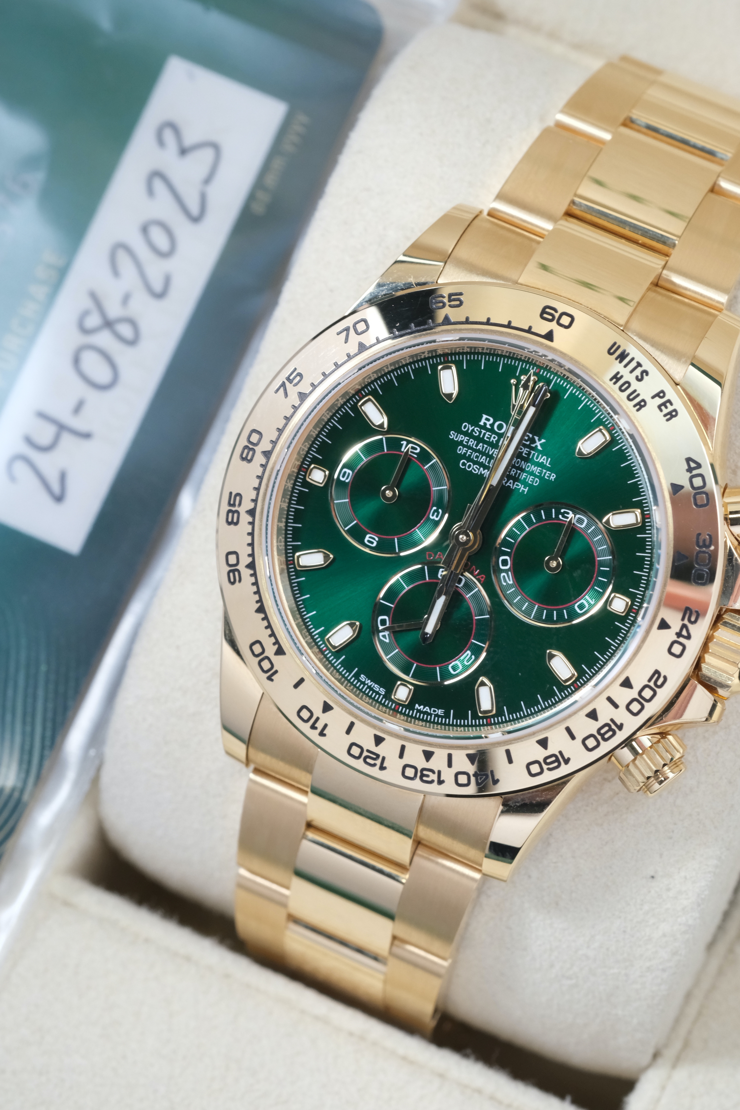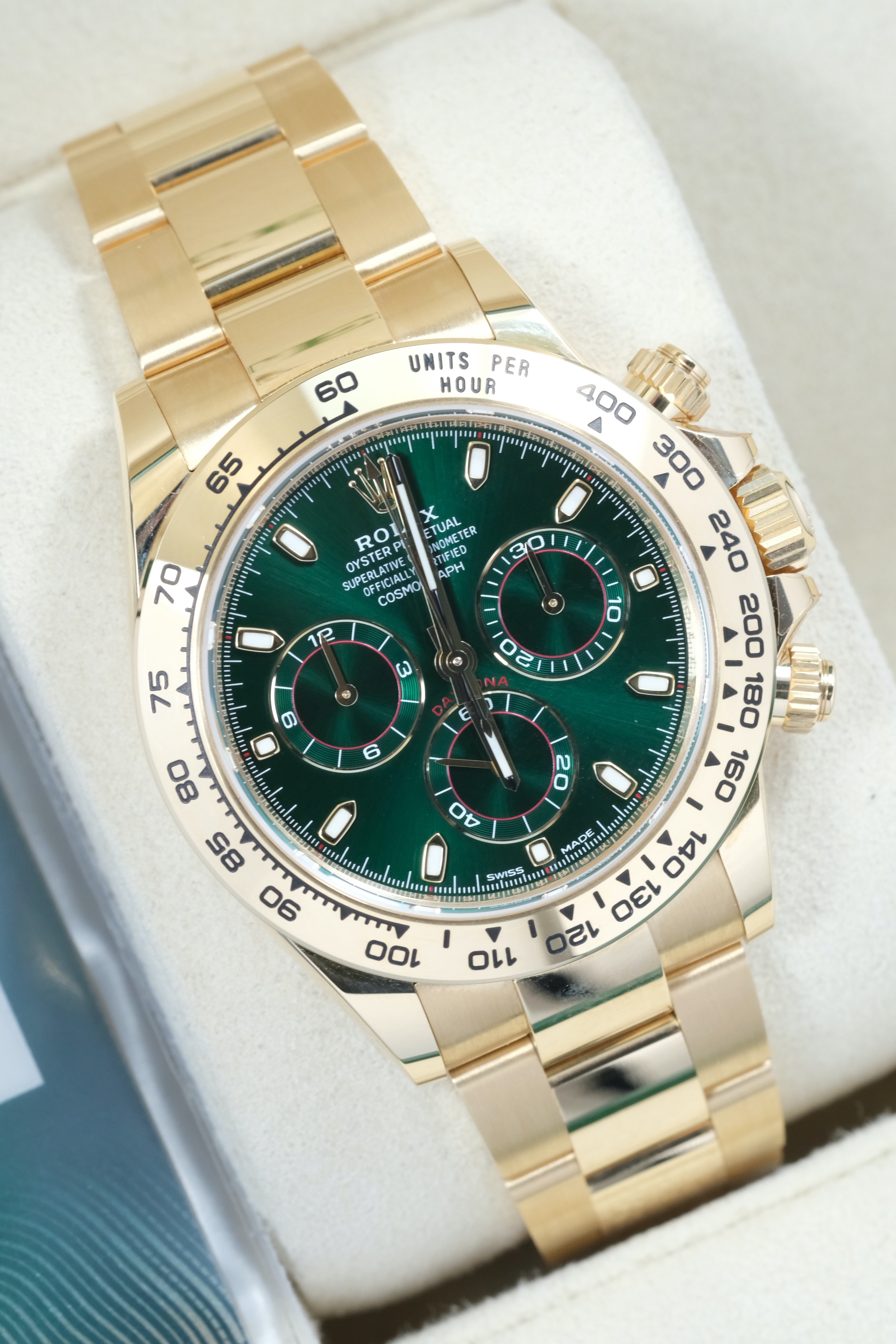 Приобретая часы Cosmograph Daytona 40mm Yellow Gold Green Dial в нашем салоне, вы не только получаете великолепный аксессуар, но и становитесь обладателем части истории и традиций великого бренда Rolex. Мы гарантируем, что каждый час, представленный в нашем салоне, проходит тщательную предпродажную подготовку и находится в идеальном состоянии, что подтверждается документами. Удобное расположение нашего офиса в Москве и наличие собственной охраняемой парковки делают процесс покупки еще более комфортным и безопасным.