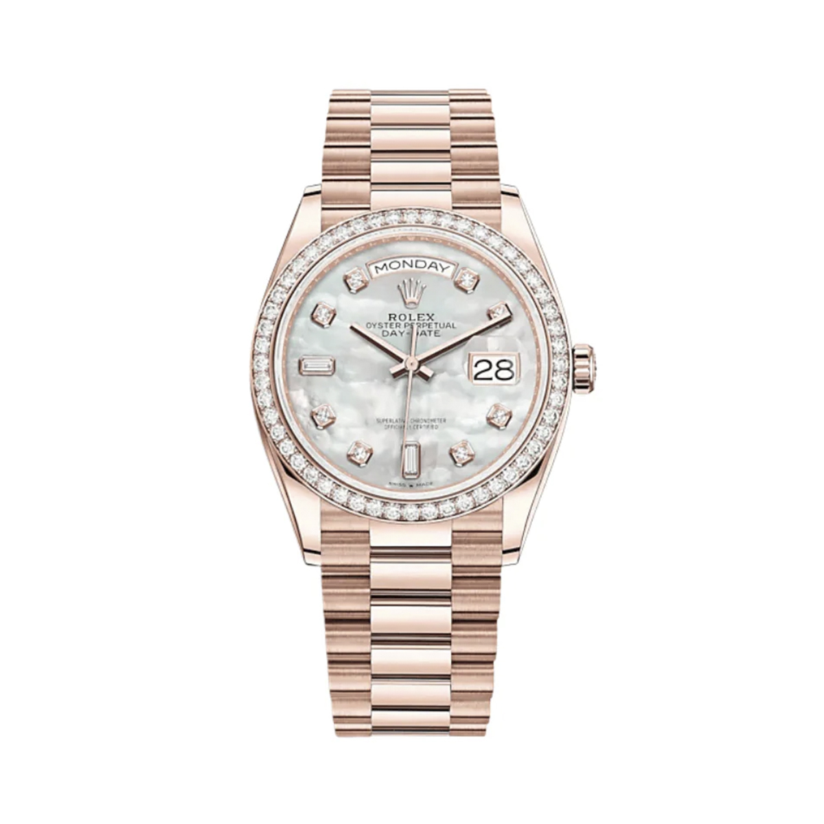 Rolex Day Date 36mm Rose Gold Mop Dial Diamond Bezel