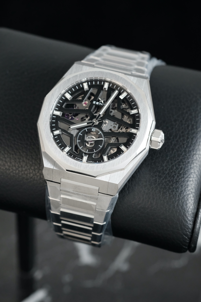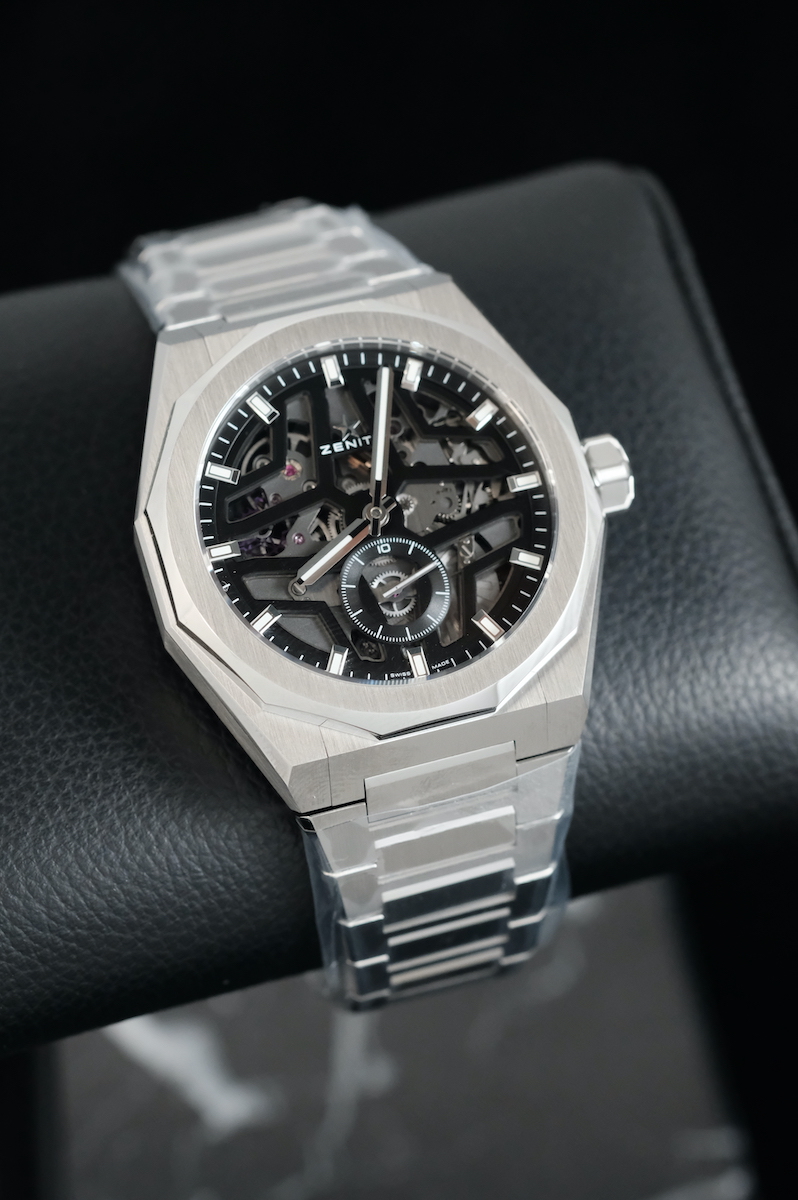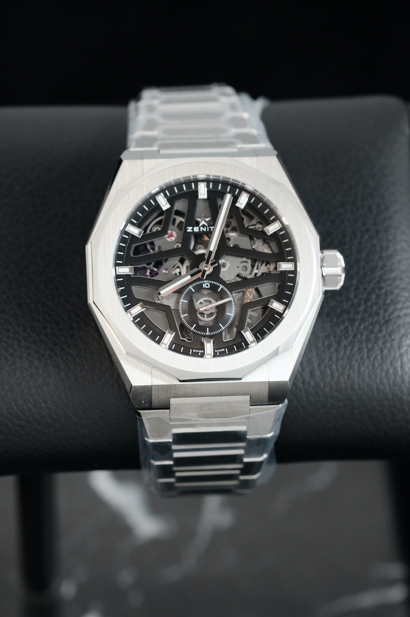 Часы DEFY Skyline Skeleton в стальном восьмиугольном корпусе диаметром 41 мм привлекают внимание фацетированным безелем и открытым циферблатом черного цвета, напоминающим культовую четырехконечную звезду ZENITH. Модель оснащена высокочастотным автоматическим мануфактурным скелетонированным механизмом El Primero 3620 SK с первым счетчиком 1/10 секунды. В комплект входят сменный стальной браслет и черный каучуковый ремешок с узором. Второй ремешок предлагается для того, чтобы вы смогли в полной мере насладиться часами с системой замены ремешка.