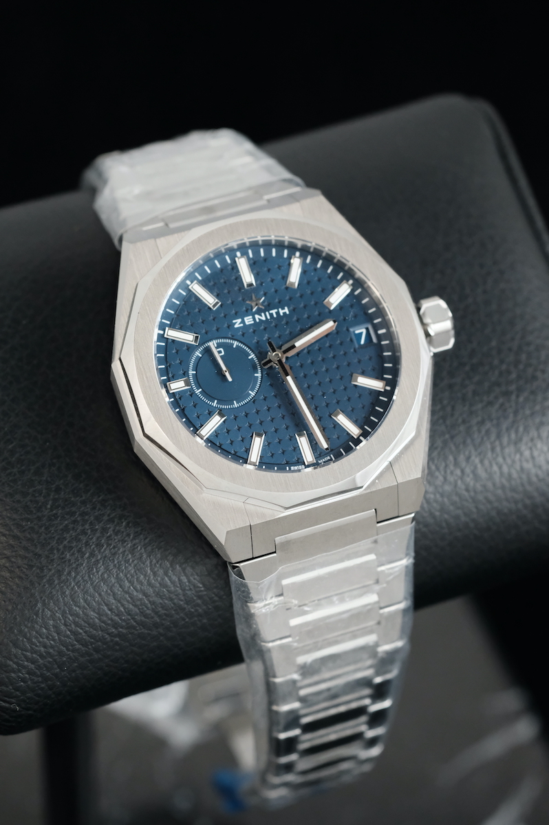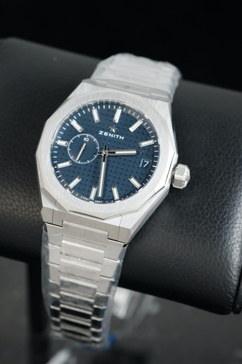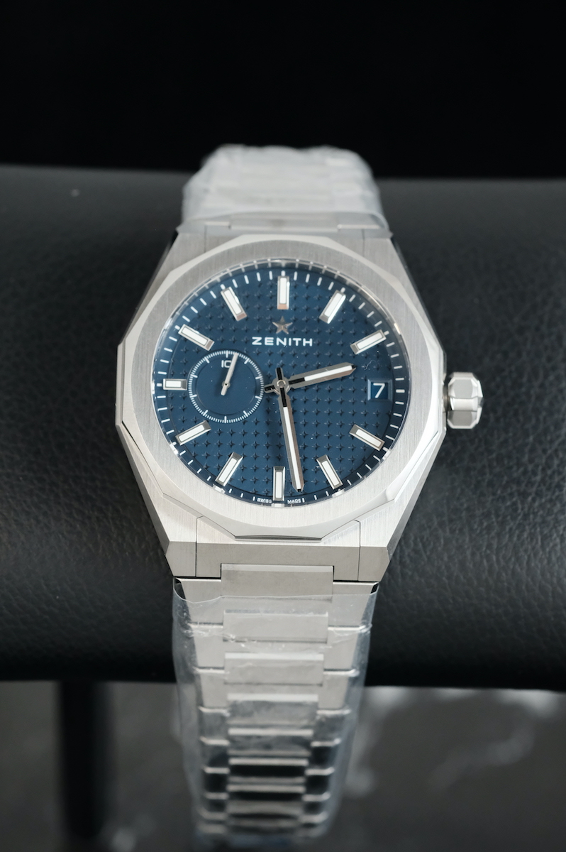 Часы DEFY Skyline представлены в стальном восьмиугольном корпусе 41 мм с фацетированным безелем и синим циферблатом с узором «солнечные лучи», напоминающим символичную четырехконечную звезду ZENITH. Оснащены высокочастотным автоматическим мануфактурным механизмом El Primero 3620 и первым счетчиком 1/10 секунды. В комплект входят сменный стальной браслет и синий каучуковый ремень с узором. Второй ремешок предлагается для того, чтобы вы смогли в полной мере насладиться часами с системой замены ремешка.