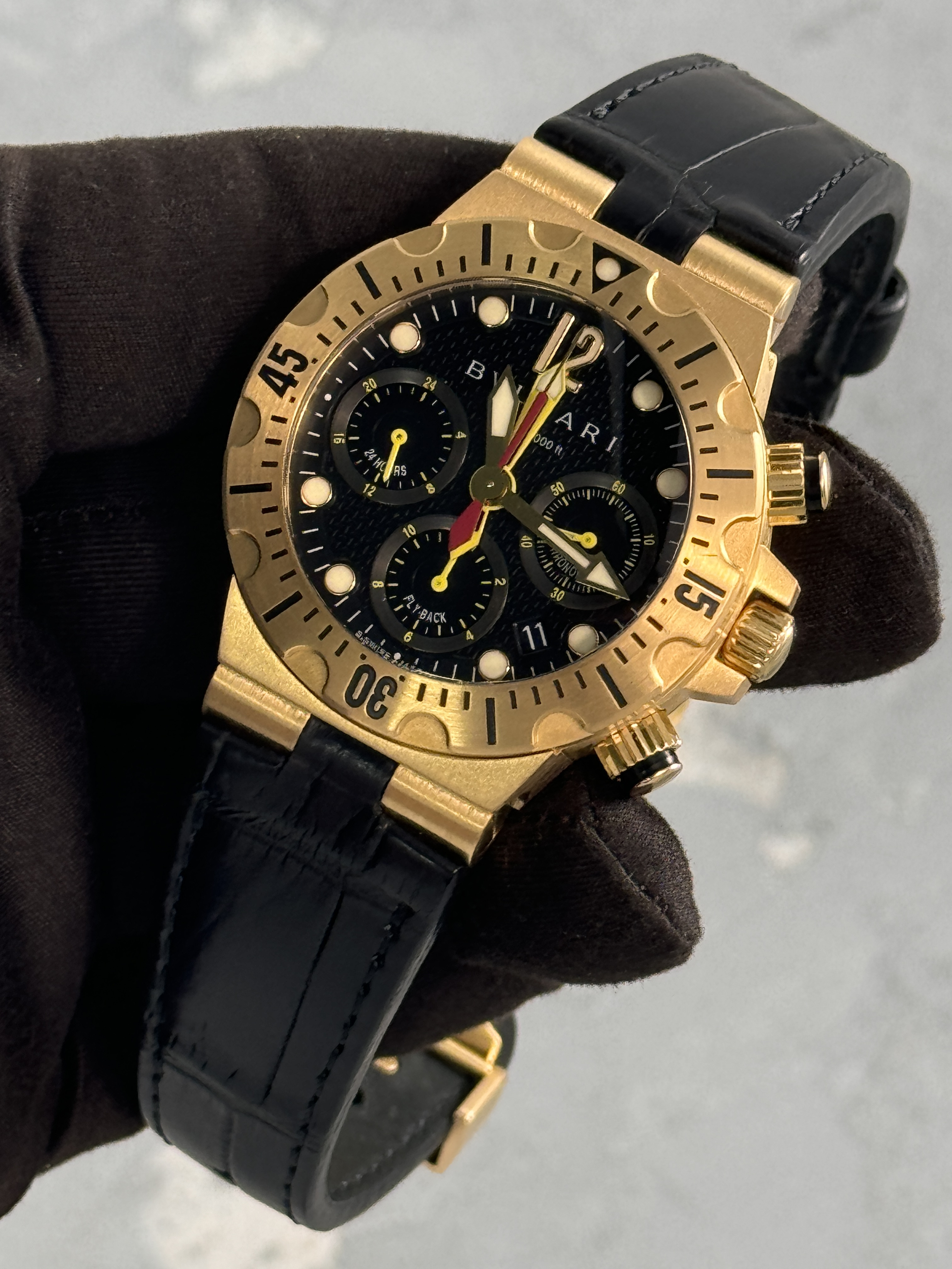 Представляем вашему вниманию эксклюзивные мужские часы Diagono Scuba Professional Diver Chronograph от известного бренда Bvlgari. Эти часы – настоящий шедевр швейцарского часового искусства, сочетающий в себе функциональность и стиль. Модель SC 40, выполненная из роскошного розового золота, станет идеальным аксессуаром для настоящего джентльмена, ценящего качество и элегантность.