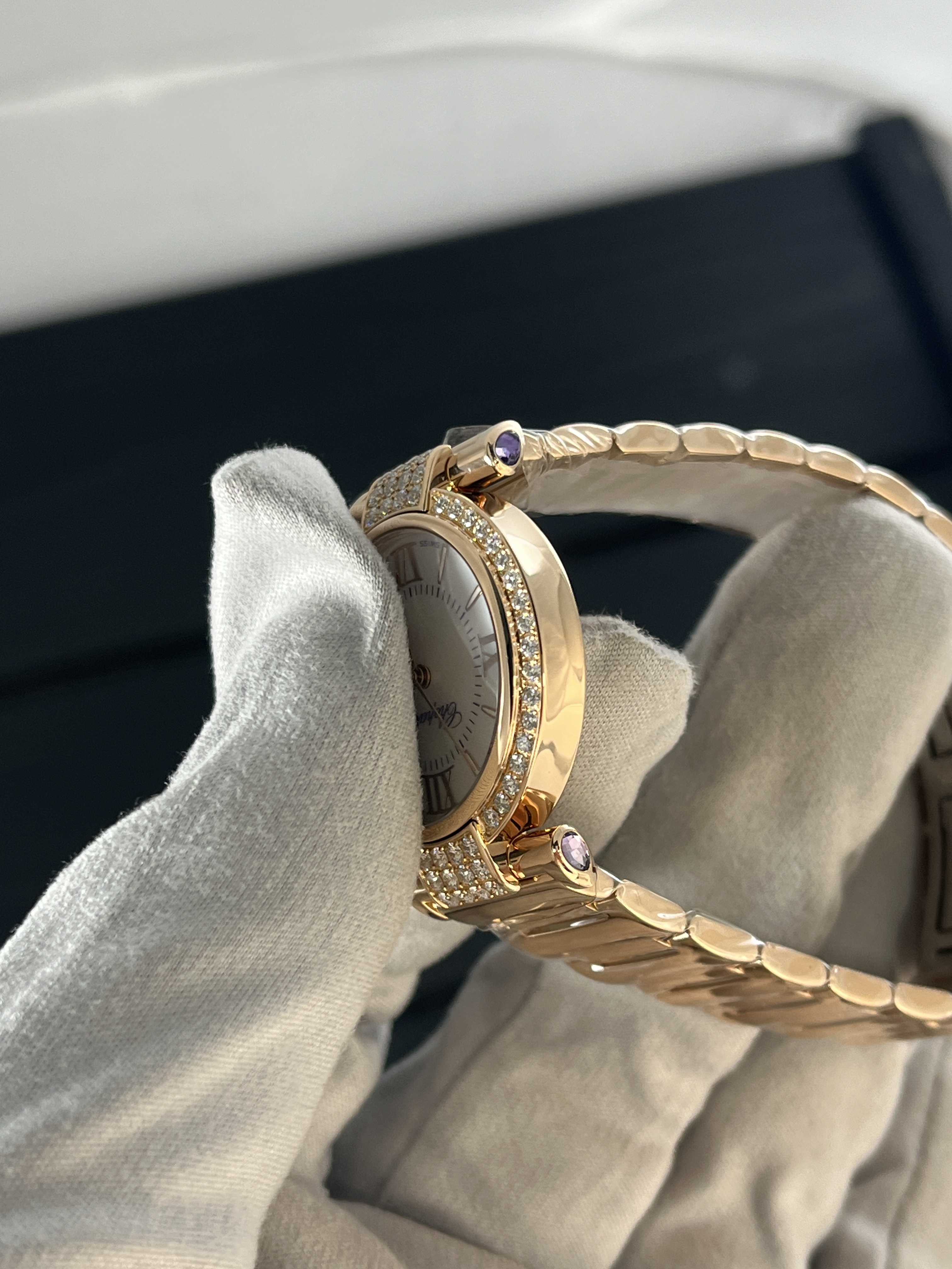 Корпус часов выполнен из роскошного розового золота, украшенного бриллиантами, что придает им особую изящность и элегантность. Браслет, изготовленный из того же материала, обеспечивает комфортное ношение и подчеркивает статус владельца. Сапфировое стекло не только защищает механизм от повреждений, но и обеспечивает идеальную видимость циферблата.
