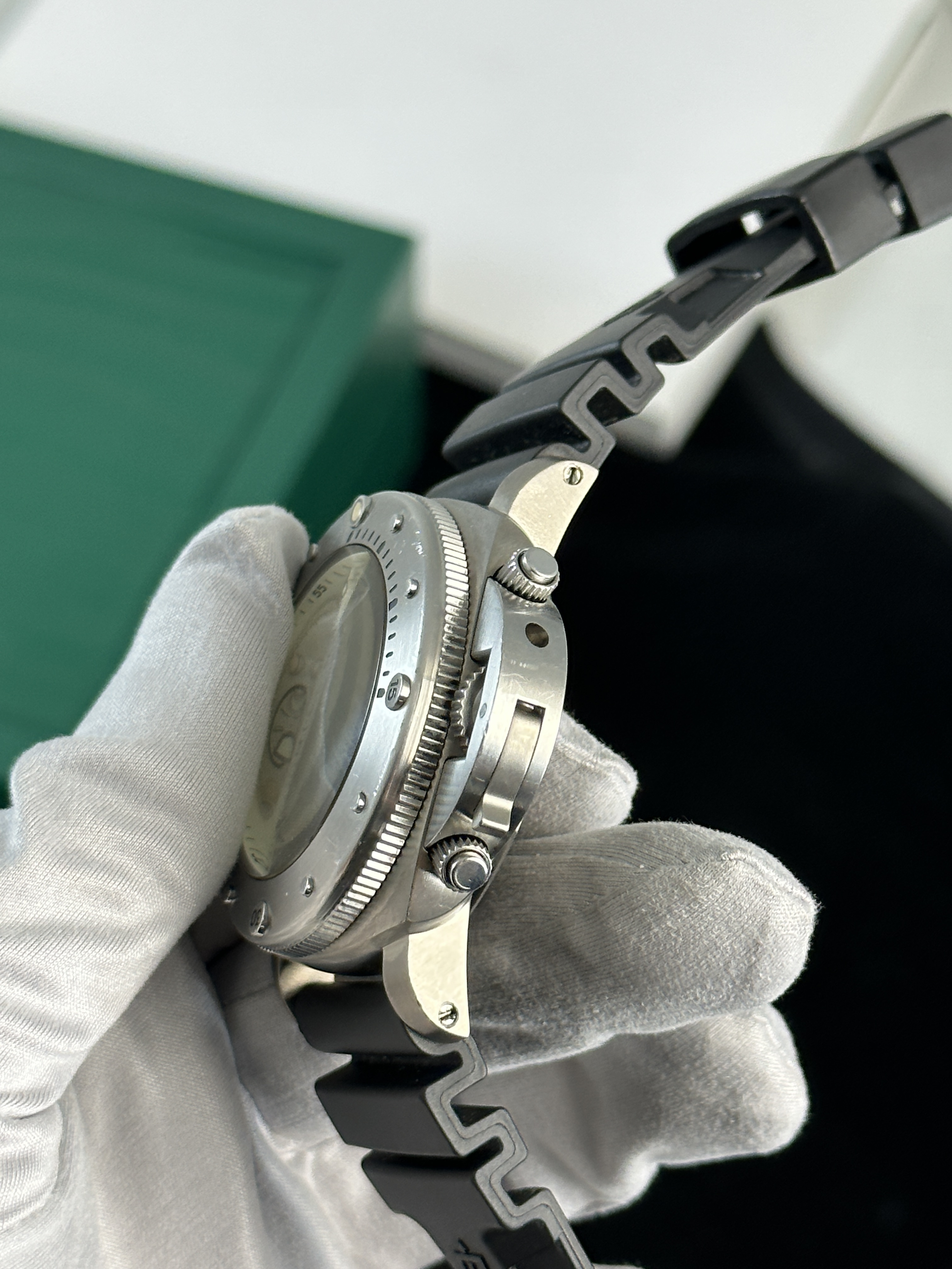 Какой часовой бренд ассоциируется у вас с морскими глубинами и непревзойденным мастерством? Безусловно, это Panerai, и именно его модель Luminor Submersible 1950 Chrono 1000m Slytech - 47 MM #001 мы предлагаем вашему вниманию в нашем часовом салоне «Мануфактура». Этот шедевр итальянского часового искусства, выпущенный в 2005 году, поражает своей функциональностью и элегантностью.