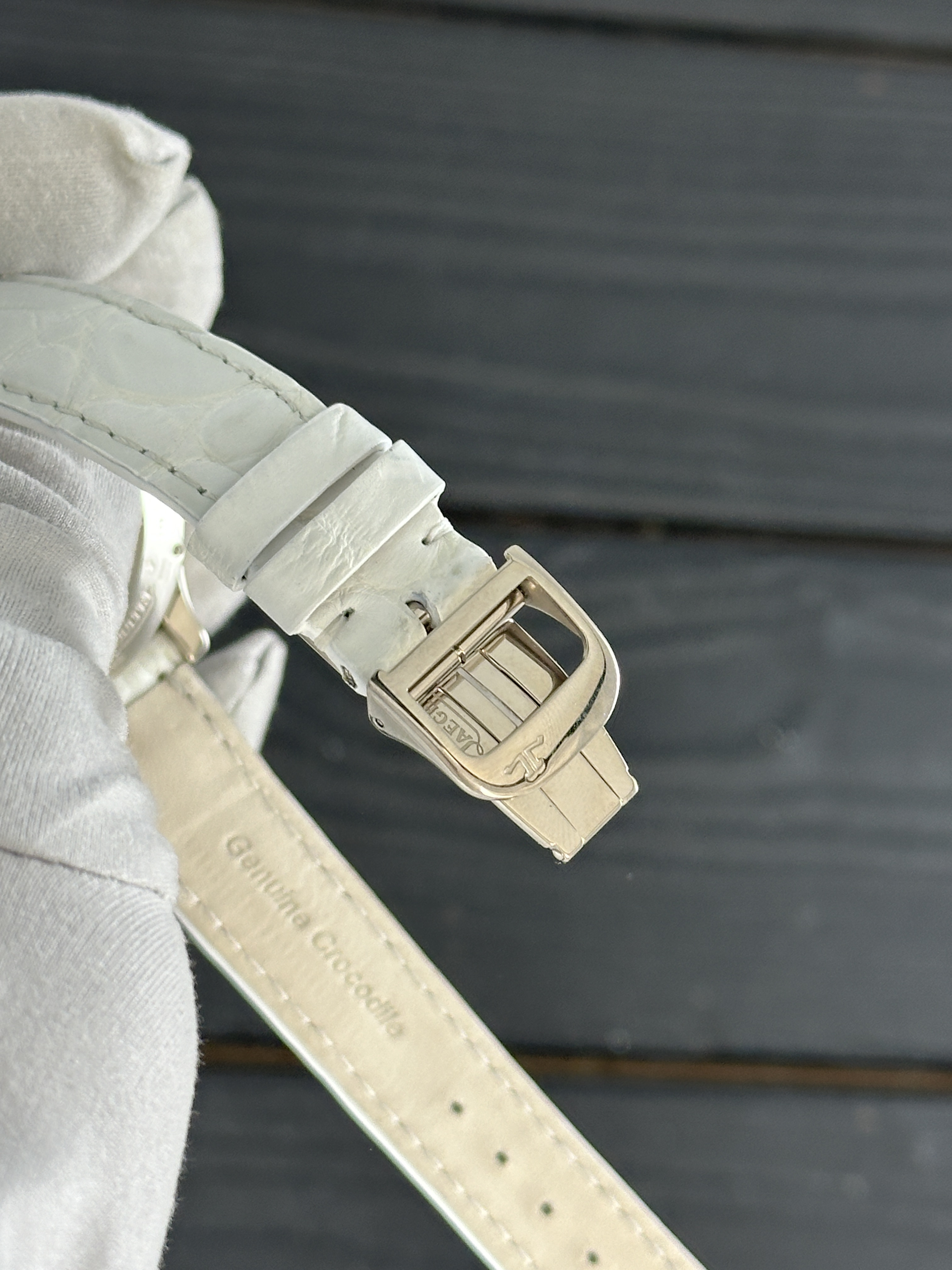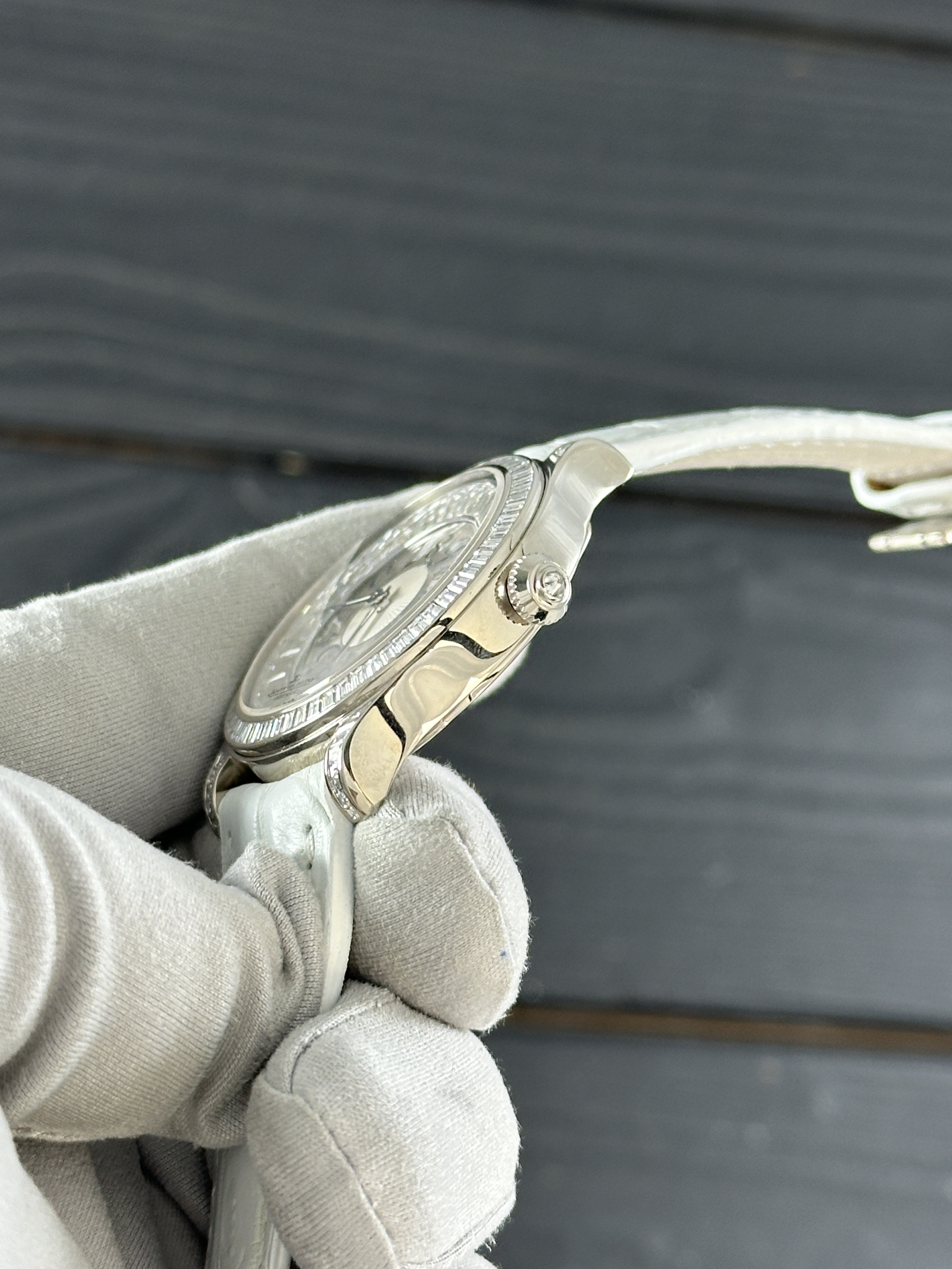 Корпус часов выполнен из белого золота и украшен бриллиантами, что придает им особую изысканность и роскошь. Размер корпуса составляет 36 мм, что делает его идеальным для любого запястья. Ремешок из натуральной кожи добавляет дополнительный шарм и комфорт в носке.