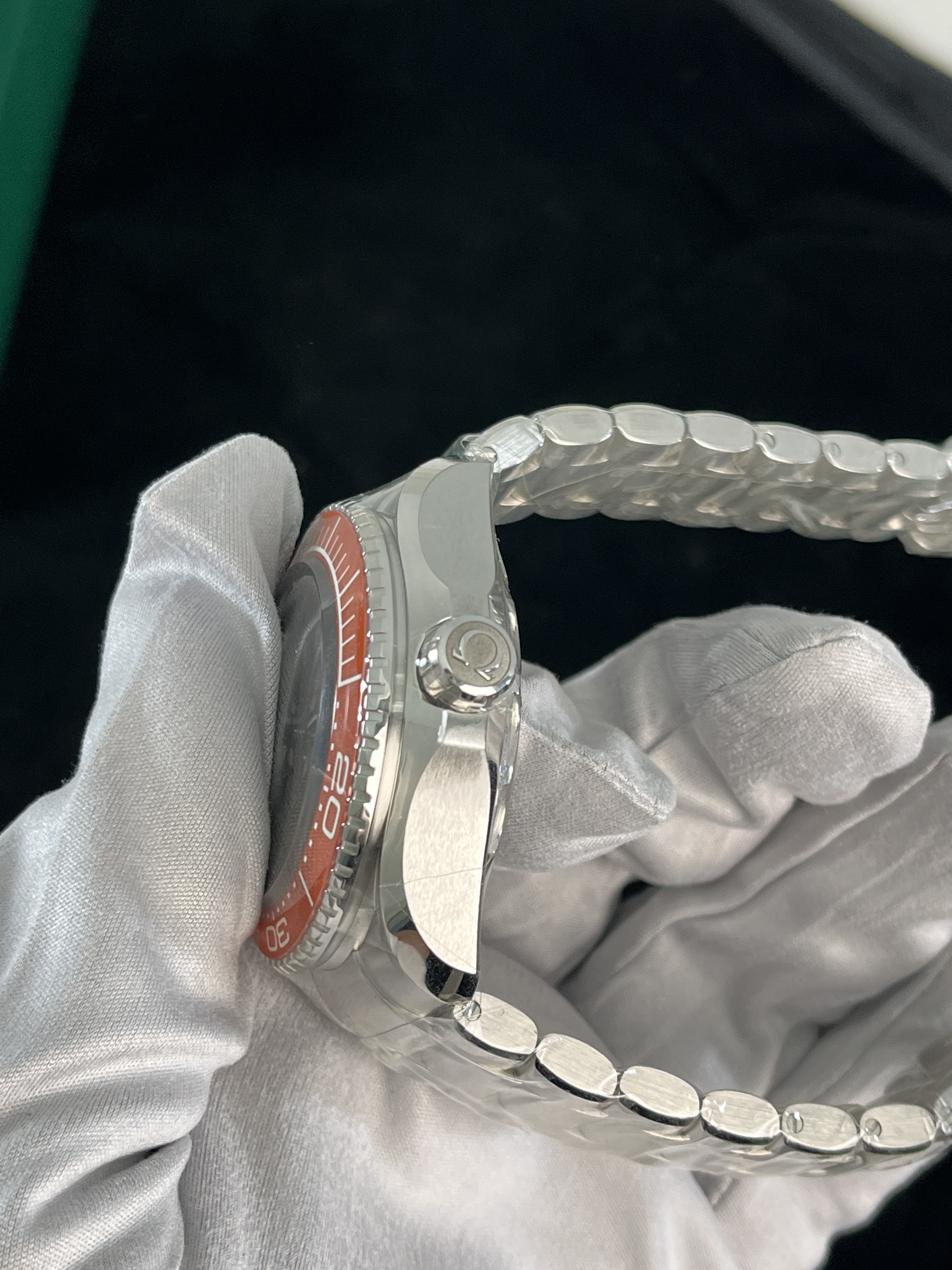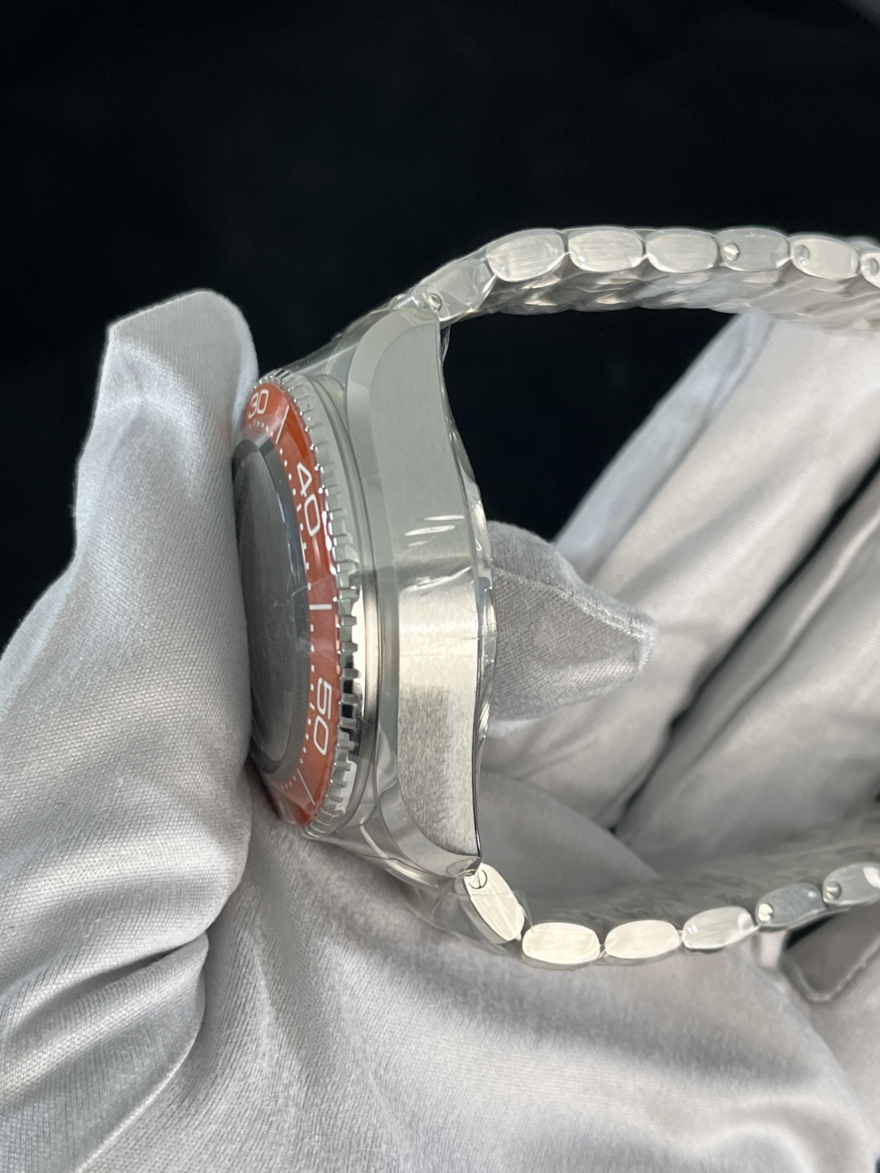 Модель диаметром 45,5 мм из прочного материала O-MEGASTEEL имеет полированный безель из керамики оранжевого цвета с дайверской шкалой из жидкой керамики и покрытием Super-LumiNova. Стрелки и индексы выполнены из 18-каратного белого золота и покрыты белым люминесцентным покрытием Super-LumiNova. На лакированный циферблат с градиентным переходом от серого к черному нанесены четыре арабские цифры оранжевого цвета, которые можно увидеть через выпуклое сапфировое стекло.
