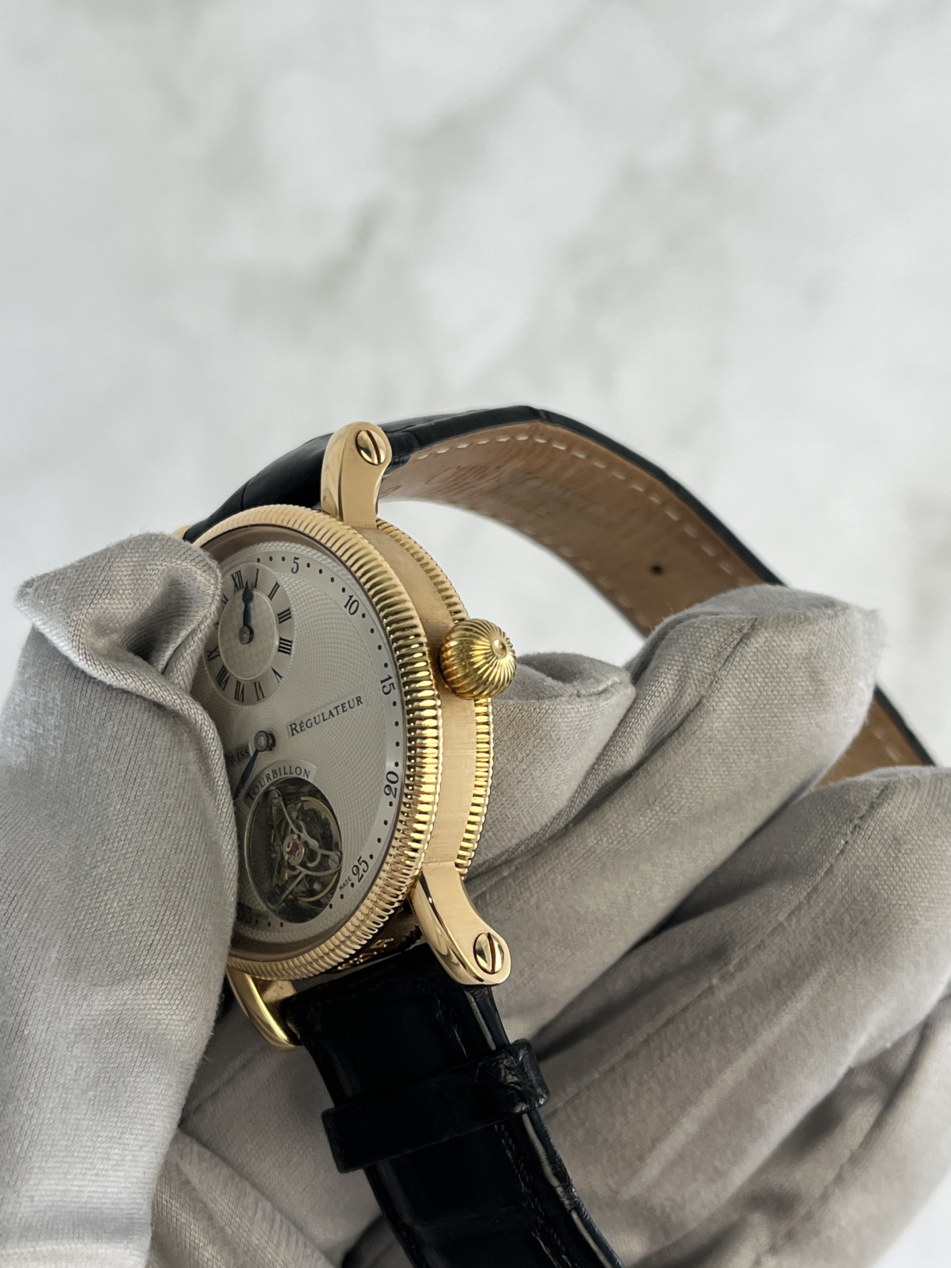 Часы Regulator Tourbillon выполнены из желтого золота, что придает им особую роскошь и статусность. Их корпус имеет размер 38 мм, что делает их идеальными для любого мужчины, независимо от его стиля. Ремешок из натуральной кожи добавляет изделию дополнительный шарм и комфорт в носке.