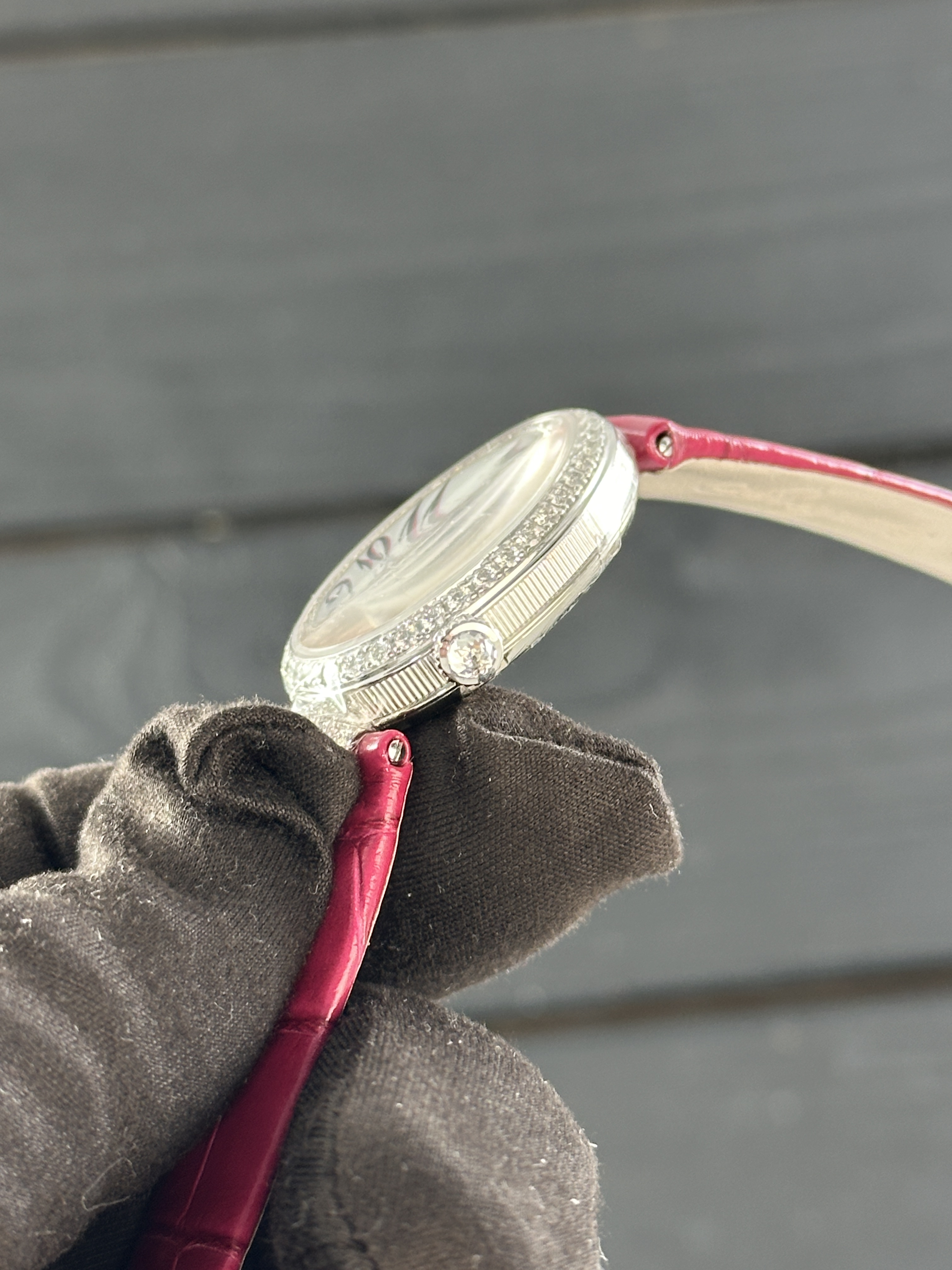 Эти часы, выполненные из белого золота и украшенные бриллиантами, представляют собой образец элегантности и изысканности. Их размер 29,0 х 37,0 мм делает их идеальными для женской руки, подчеркивая ее утонченность и стиль. Механизм с автоподзаводом обеспечивает точность и надежность работы часов, а кожаный ремешок добавляет им дополнительный шарм и комфорт в носке.