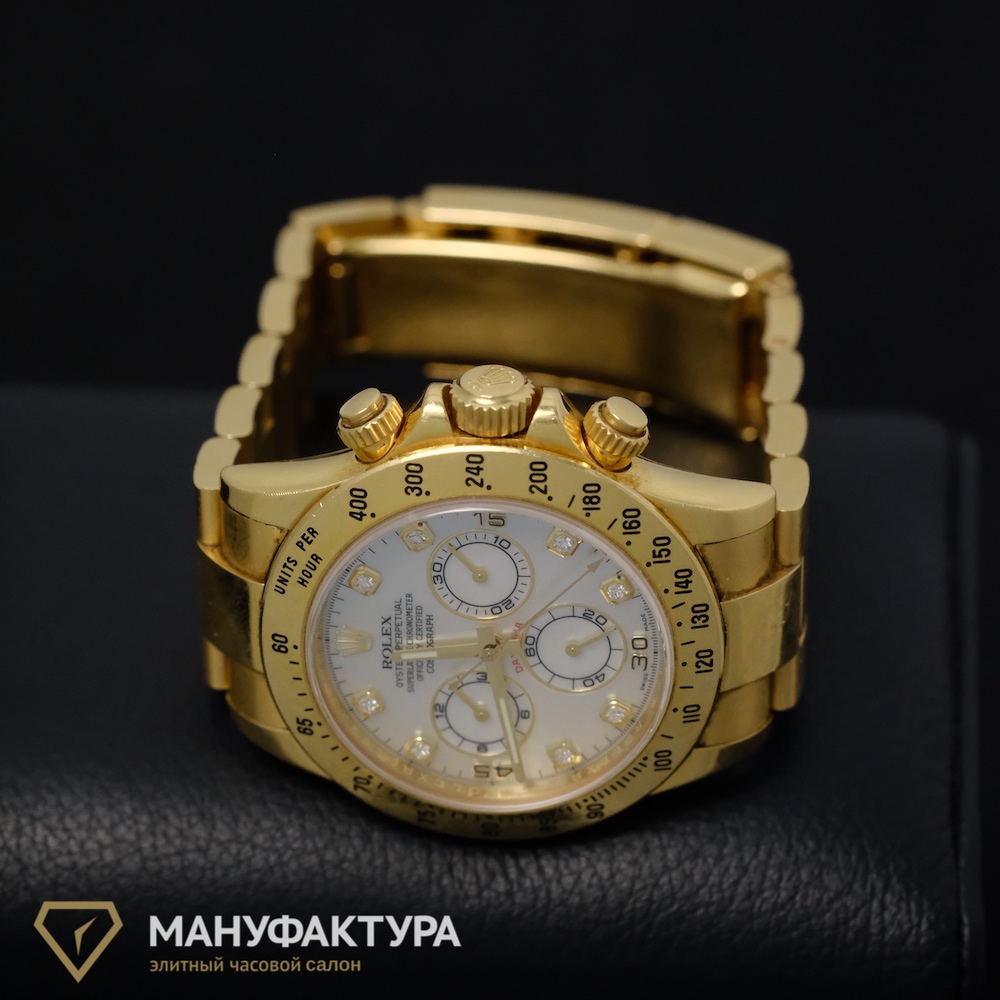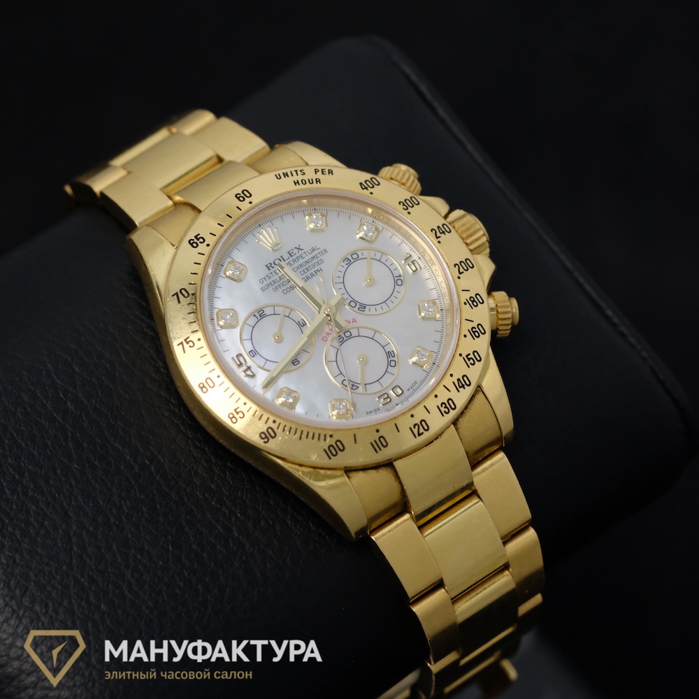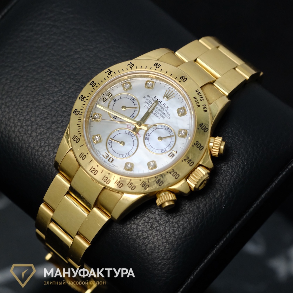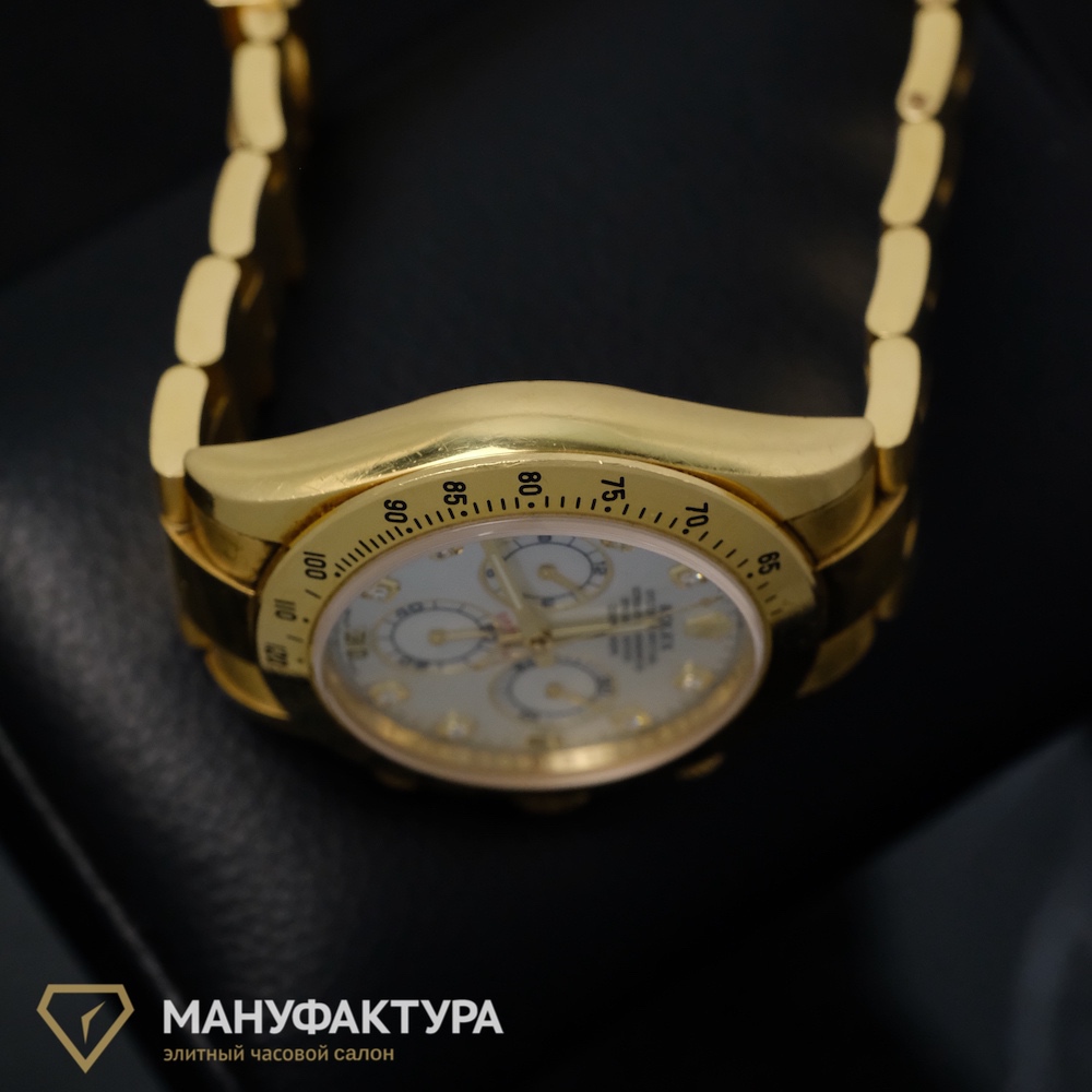 Daytona Yellow Gold White MOP Dial – это не просто часы, это хронограф, который позволяет не только отслеживать время, но и измерять интервалы времени. Автоподзавод обеспечивает бесперебойную работу механизма, а запас хода до 70 часов позволяет не беспокоиться о необходимости подзарядки в течение нескольких дней.