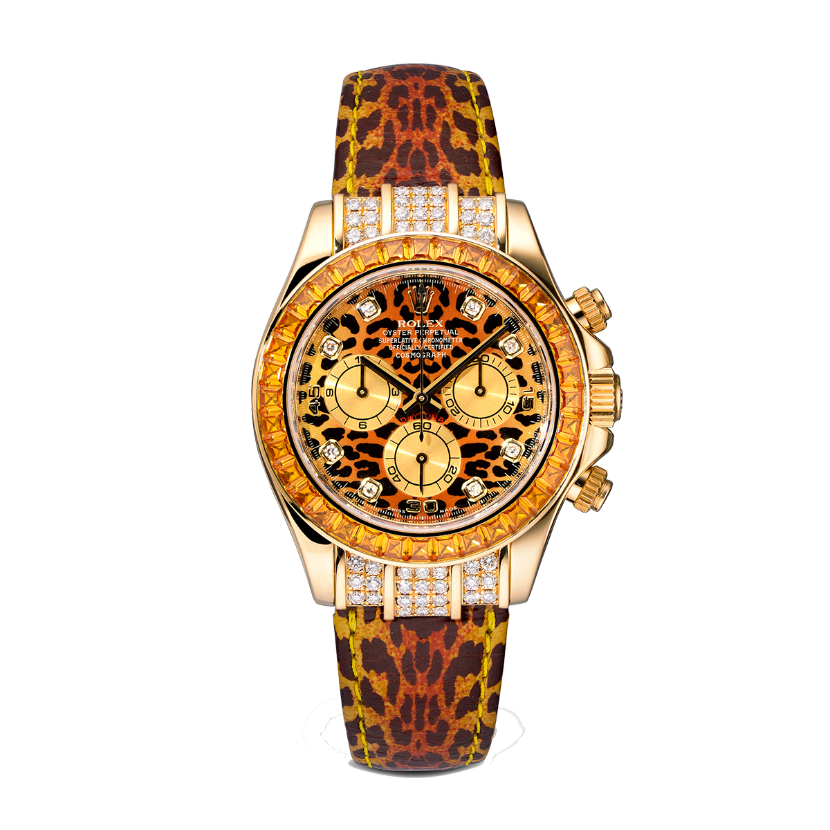 Daytona Leopard Custom оснащены двумя основными функциями: автоподзаводом и хронографом. Это делает их не только стильным аксессуаром, но и функциональным инструментом для тех, кто ценит точность и надежность. Сапфировое стекло обеспечивает отличную видимость циферблата, а водонепроницаемость на глубину до 100 метров делает их идеальными для любителей активного отдыха.