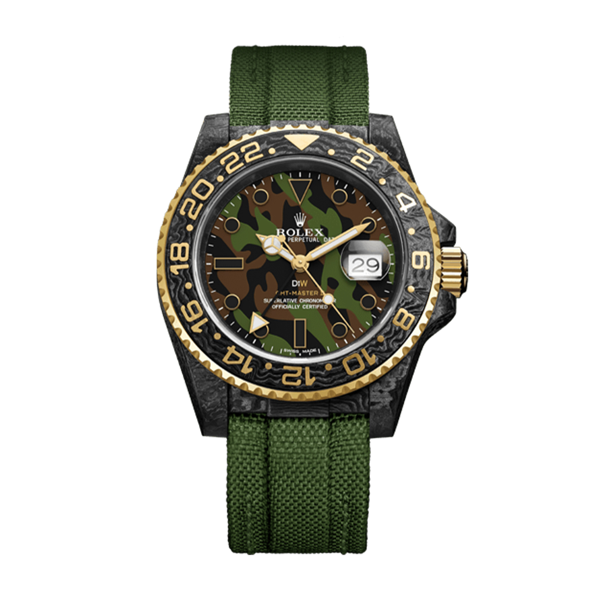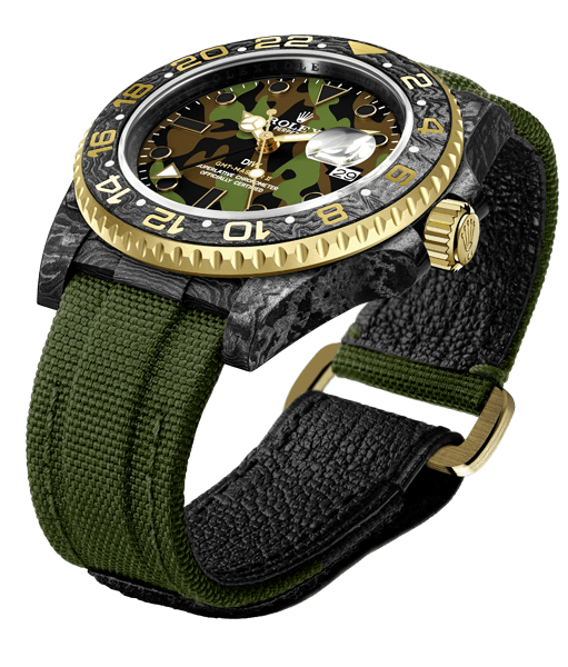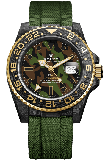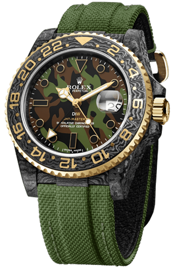Какой часовой бренд ассоциируется у вас с непревзойденным качеством, стилем и статусом? Безусловно, это Rolex, и именно в нашем часовом салоне «Мануфактура» вы можете приобрести эксклюзивные швейцарские часы, которые станут вашим надежным спутником на долгие годы. Представляем вашему вниманию модель GMT Carbon Military 2021 от бренда Rolex DiW, которая поражает своей мужественностью и функциональностью.