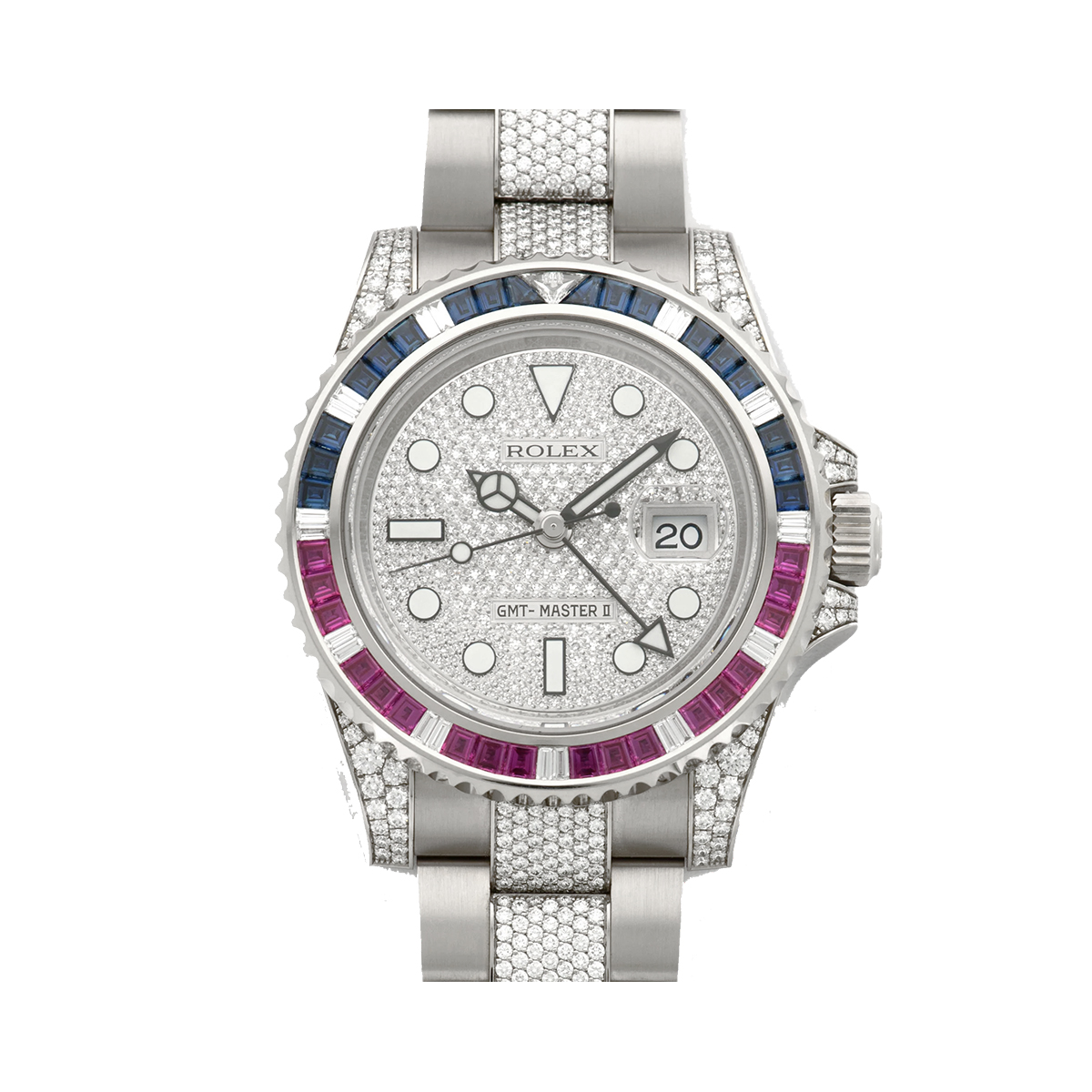 Эти часы представляют собой настоящий шедевр часового искусства, сочетая в себе изысканный дизайн и высокую функциональность. Корпус выполнен из белого золота, украшенного бриллиантами, сапфирами и рубинами, что придает часам особую роскошь и элегантность. Браслет из белого золота обеспечивает комфортное ношение и подчеркивает статус владельца.
