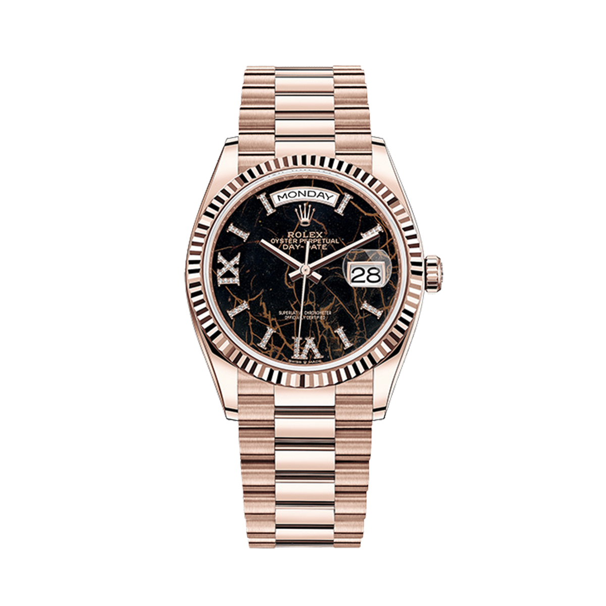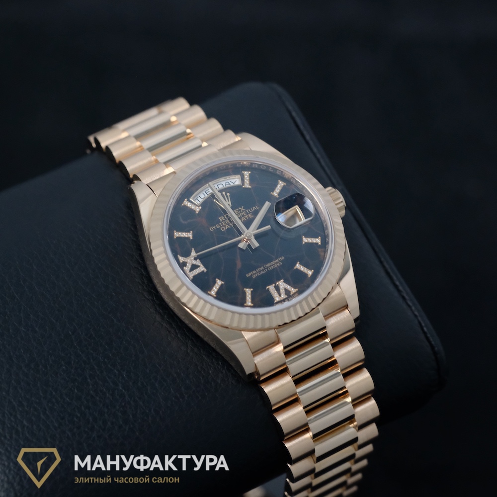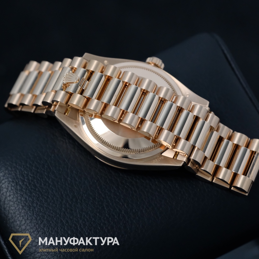 OYSTER PERPETUAL DAY-DATE 36 EVEROSE GOLD EISENKIESEL оснащены калибром 3255, разработанным и произведенным компанией Rolex, что обеспечивает высокую точность и надежность хода. Автоподзавод, индикатор дня недели и даты делают эти часы не только стильным аксессуаром, но и функциональным устройством для современной женщины.