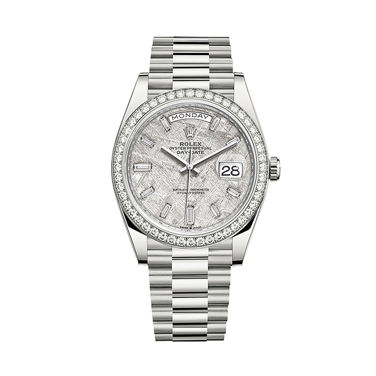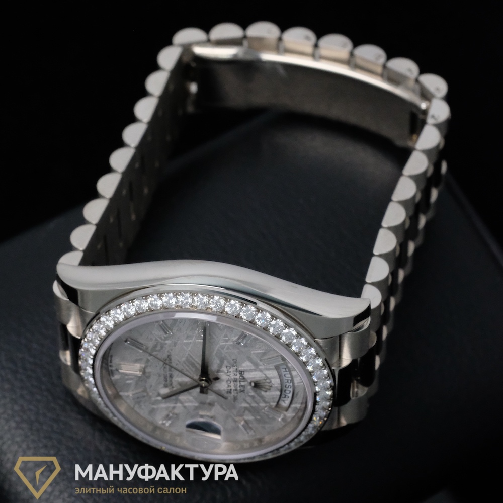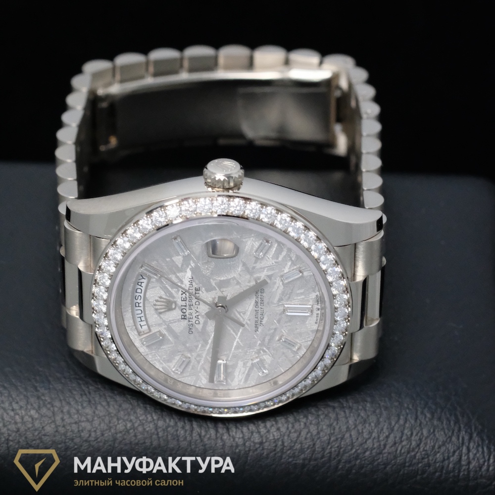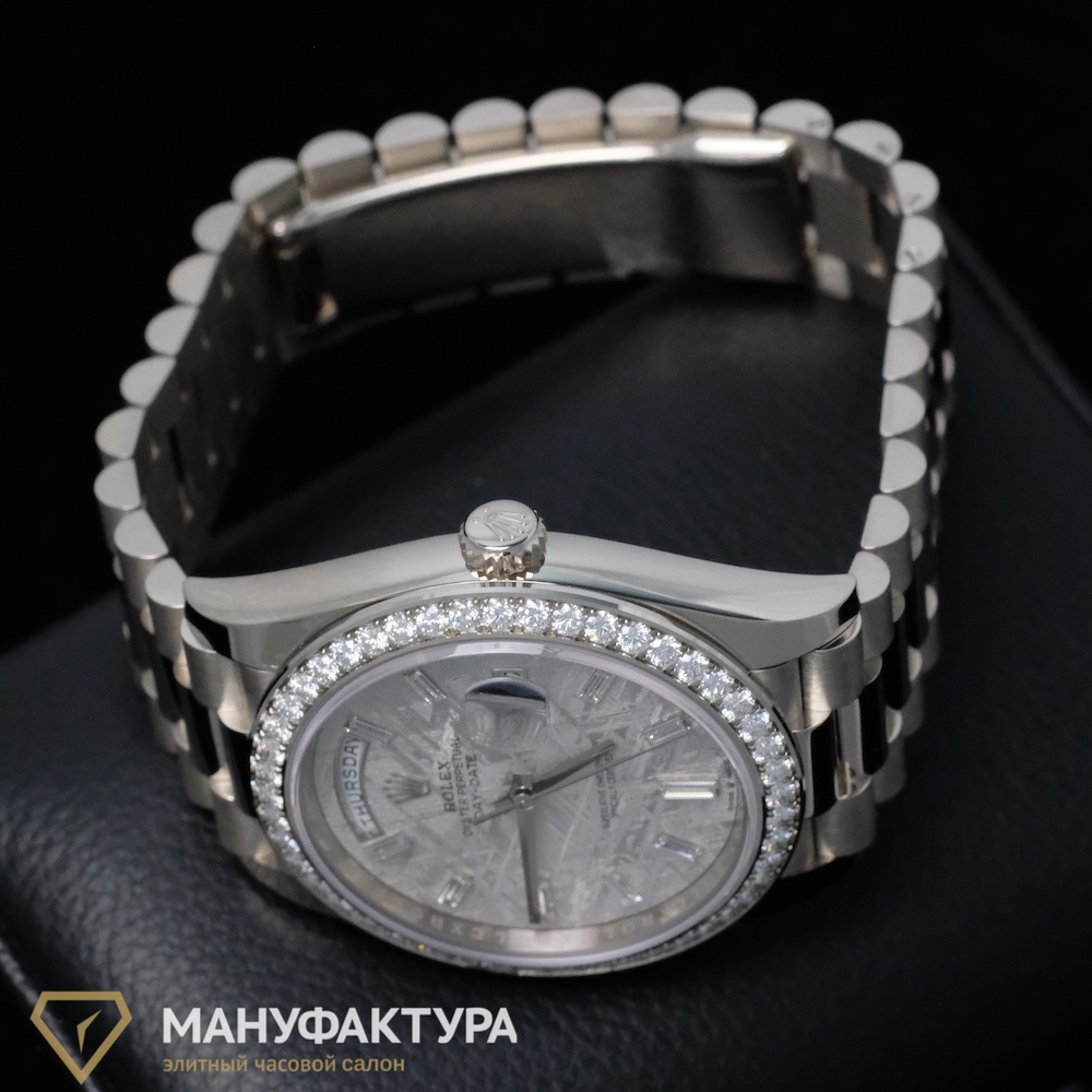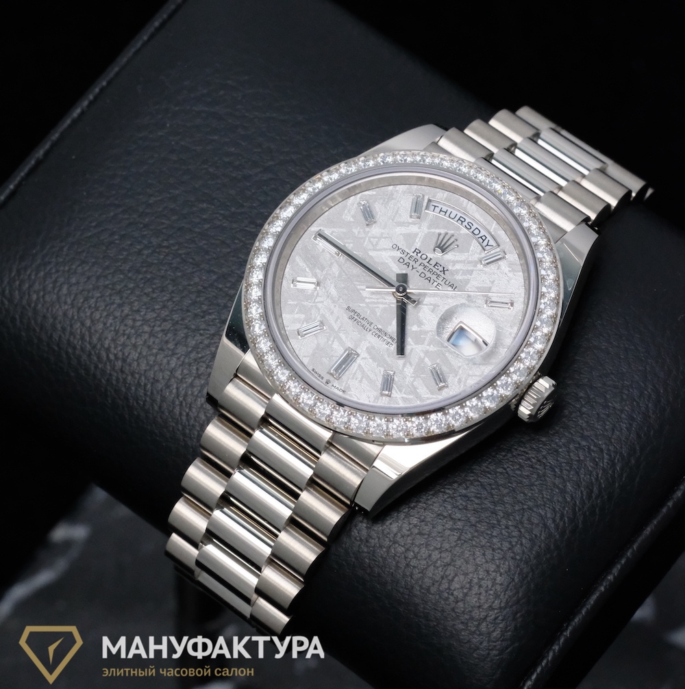 Какой подарок может быть более значимым и долговечным, чем швейцарские часы от бренда Rolex? В часовом салоне «Мануфактура» мы предлагаем вам уникальную возможность приобрести часы Oyster Perpetual Day-Date 40 mm White Gold Meteorite Dial Factory Diamonds, которые станут не только стильным аксессуаром, но и надежным спутником на протяжении многих лет.