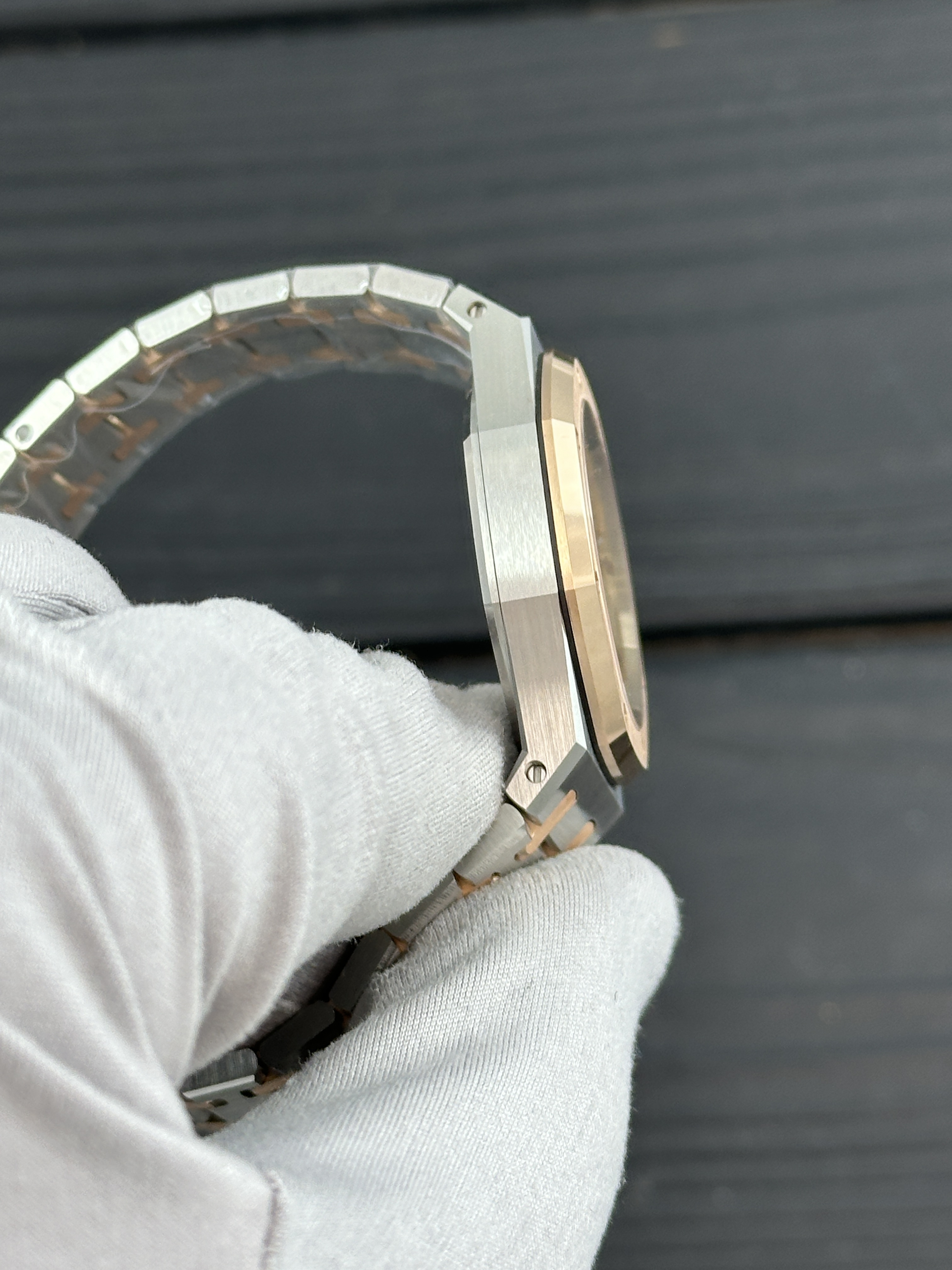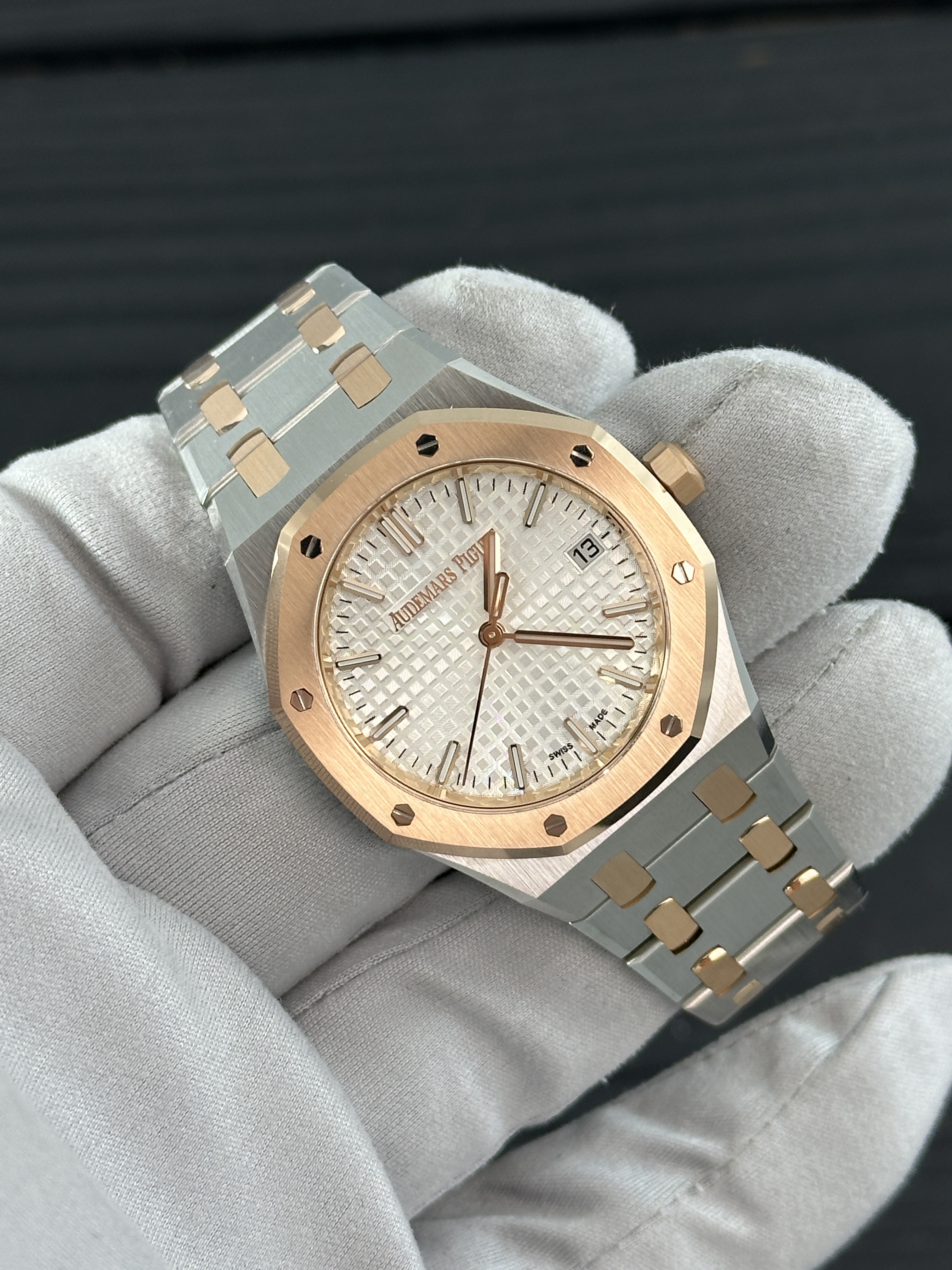Модель Royal Oak 34mm Steel And Yellow Gold - это настоящий шедевр, который сочетает в себе изысканный дизайн и техническое совершенство. Корпус из стали и розового золота создает неповторимый внешний вид, который подчеркивает статус и стиль своего владельца. Браслет из того же материала добавляет дополнительный акцент на роскошь и элегантность.