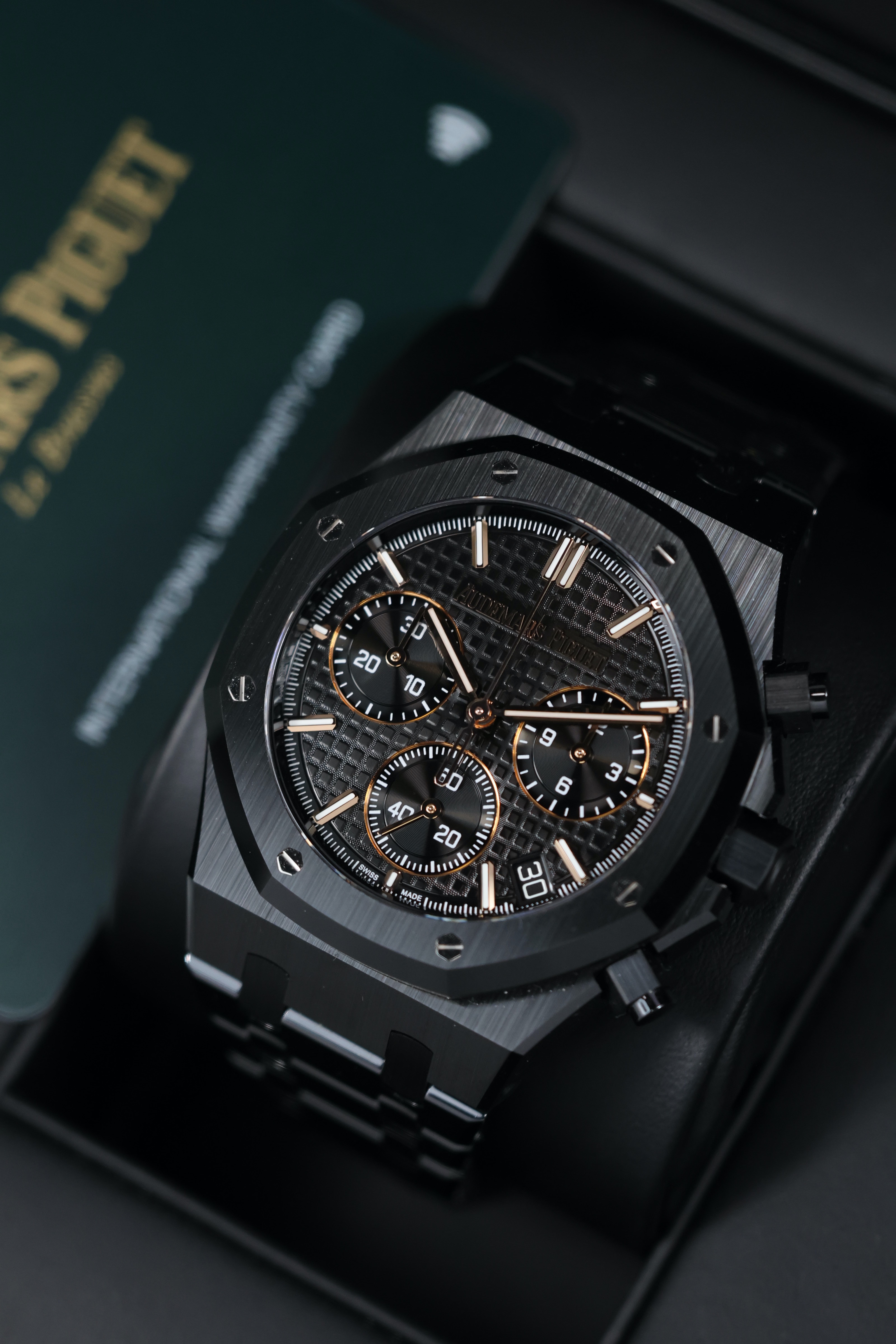 Buy Audemars Piguet Royal Oak Chronograph 41 mm Black Ceramic in UAE and explore the fascinating world of complications. This mechanical self-winding marvel features a chronograph and date functions, meticulously crafted by the revered Swiss watchmaker. Powered by the innovative caliber 4401, it guarantees precision and reliability, setting a new standard in the realm of haute horlogerie.