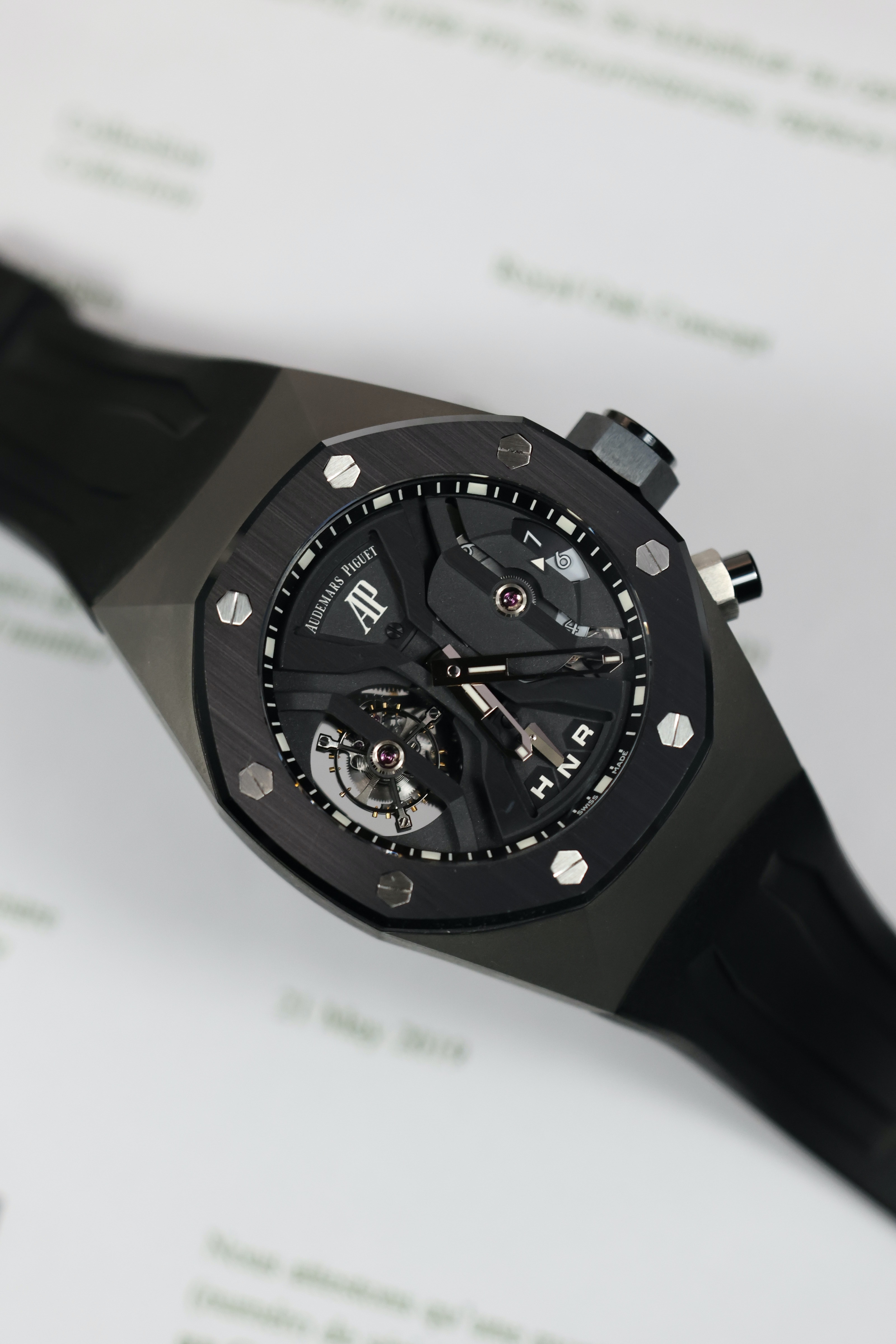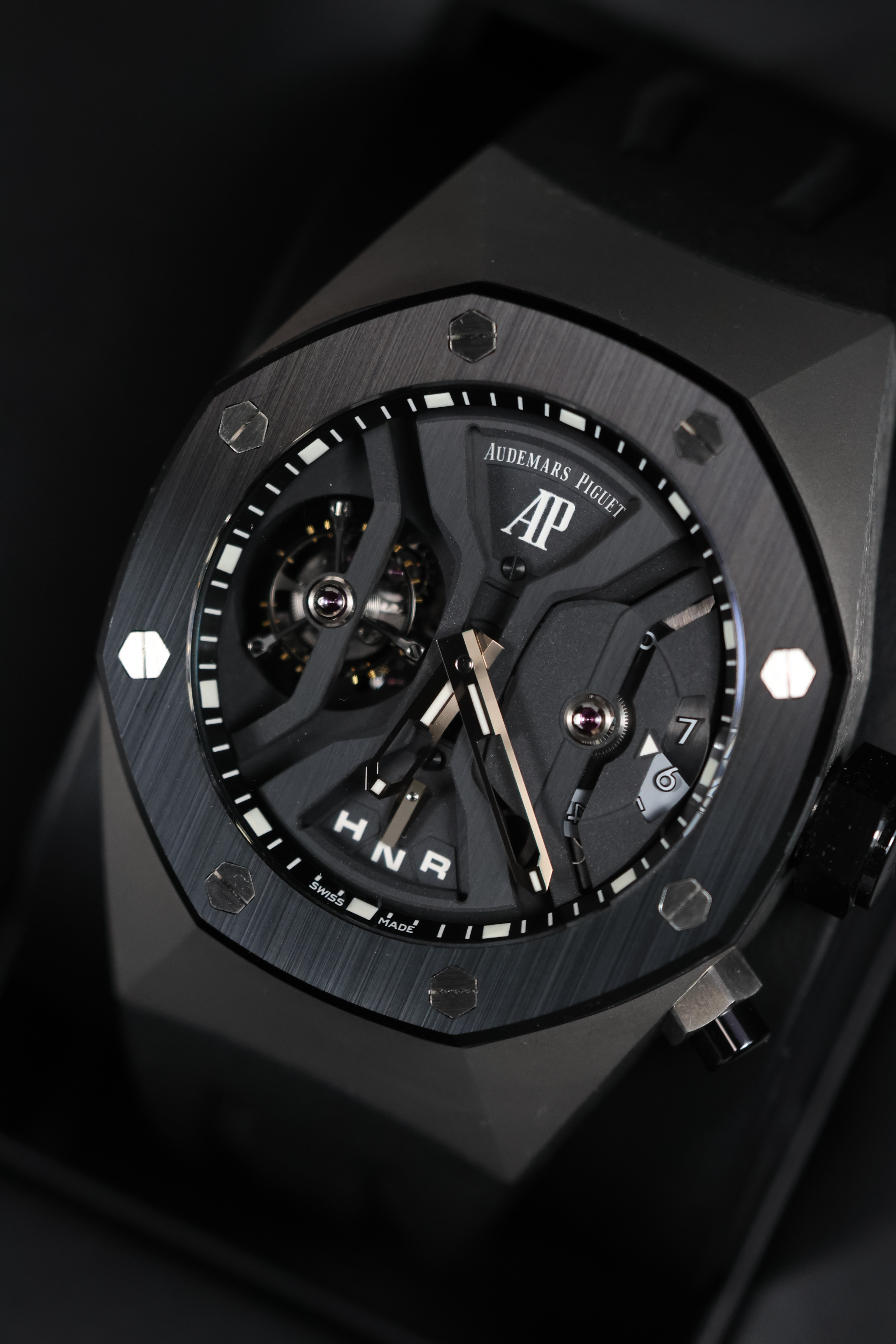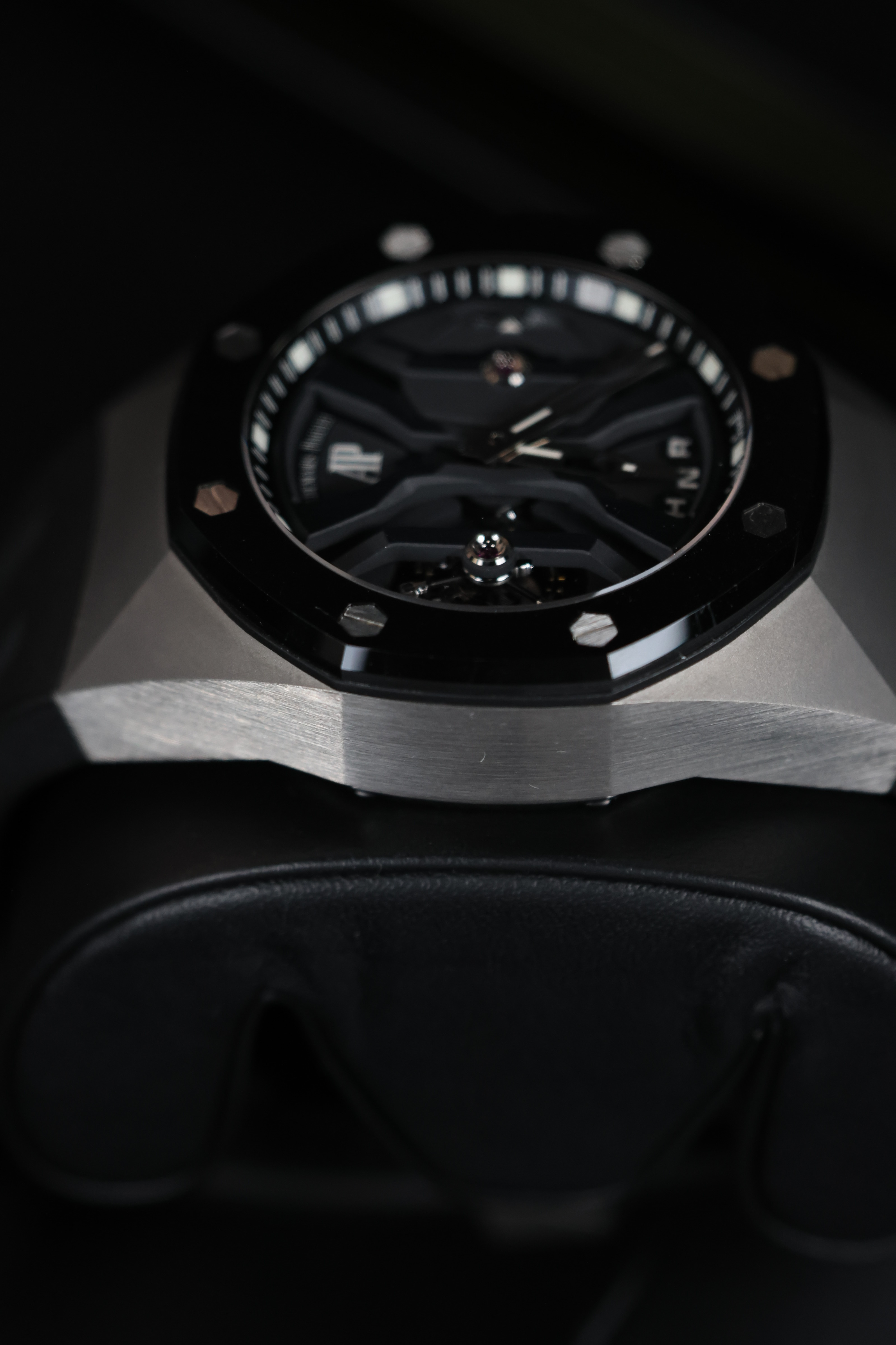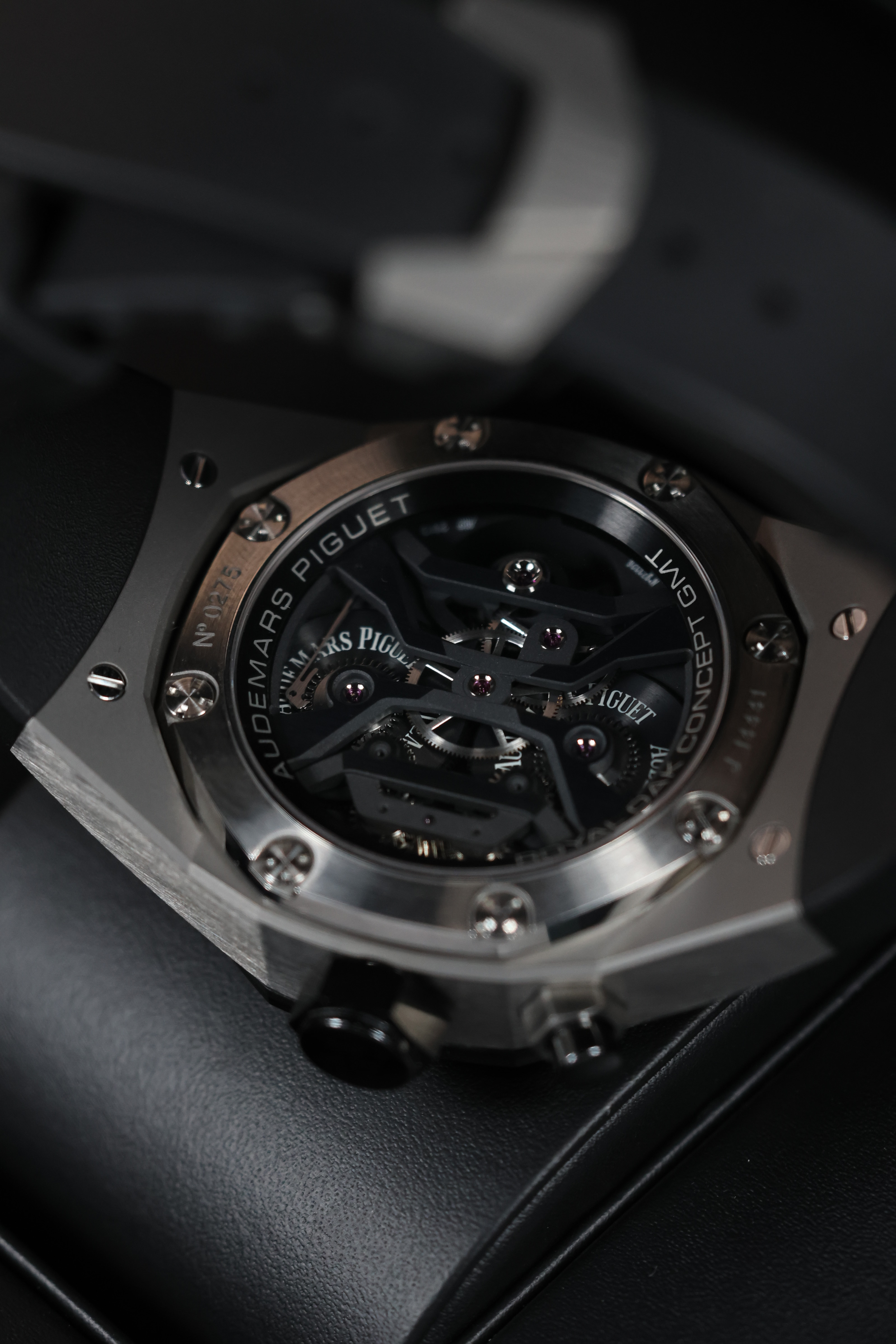 Модель Royal Oak Concept GMT Tourbillon 44 mm, обозначенная как 26560IO.OO.D002CA.01, является настоящим произведением искусства, сочетающим в себе технические инновации и элегантный дизайн. Эти мужские часы изготовлены из титана и керамики, что обеспечивает им легкость и прочность, а также делает их идеальными для активных мужчин, ценящих комфорт и стиль.