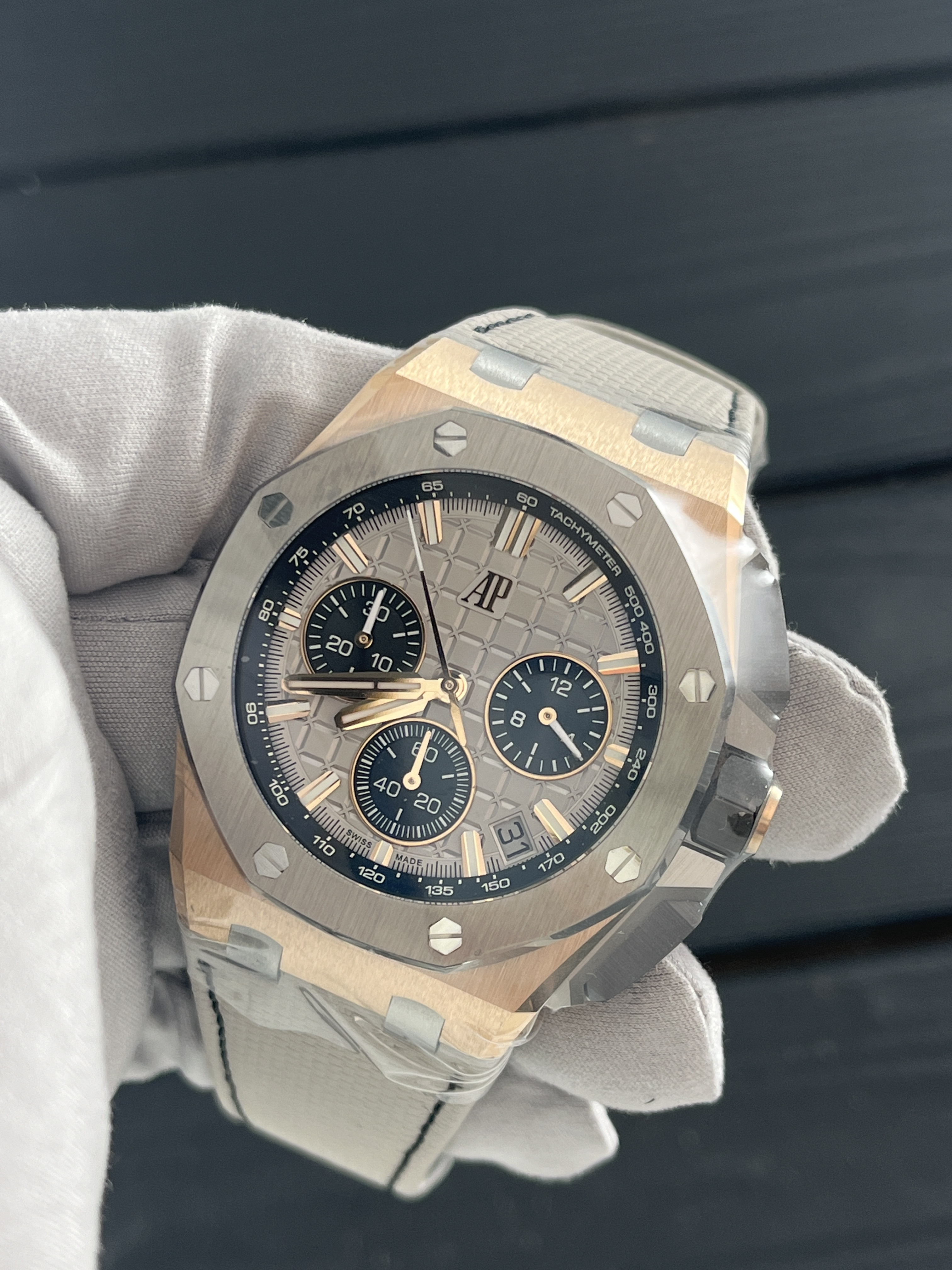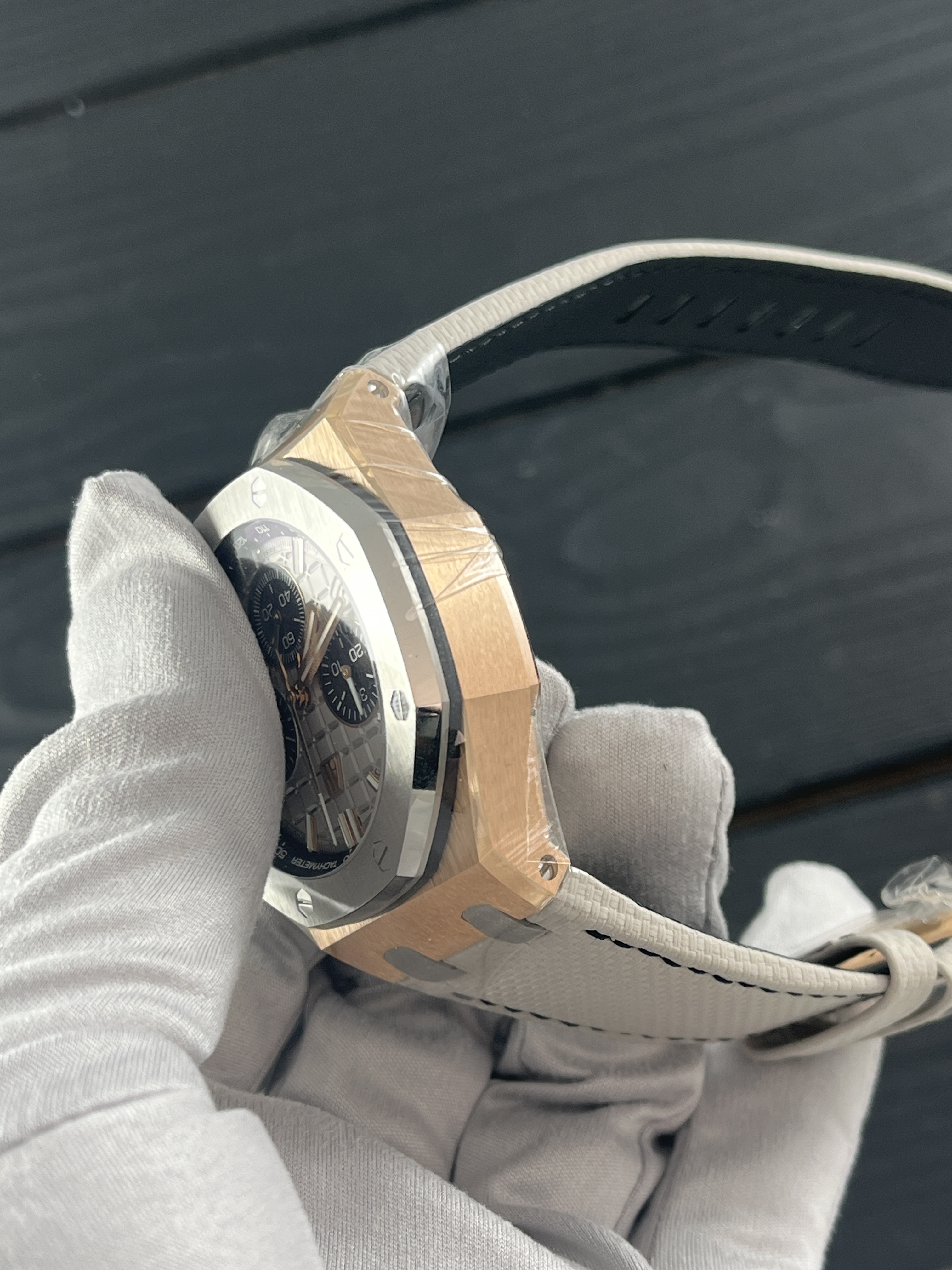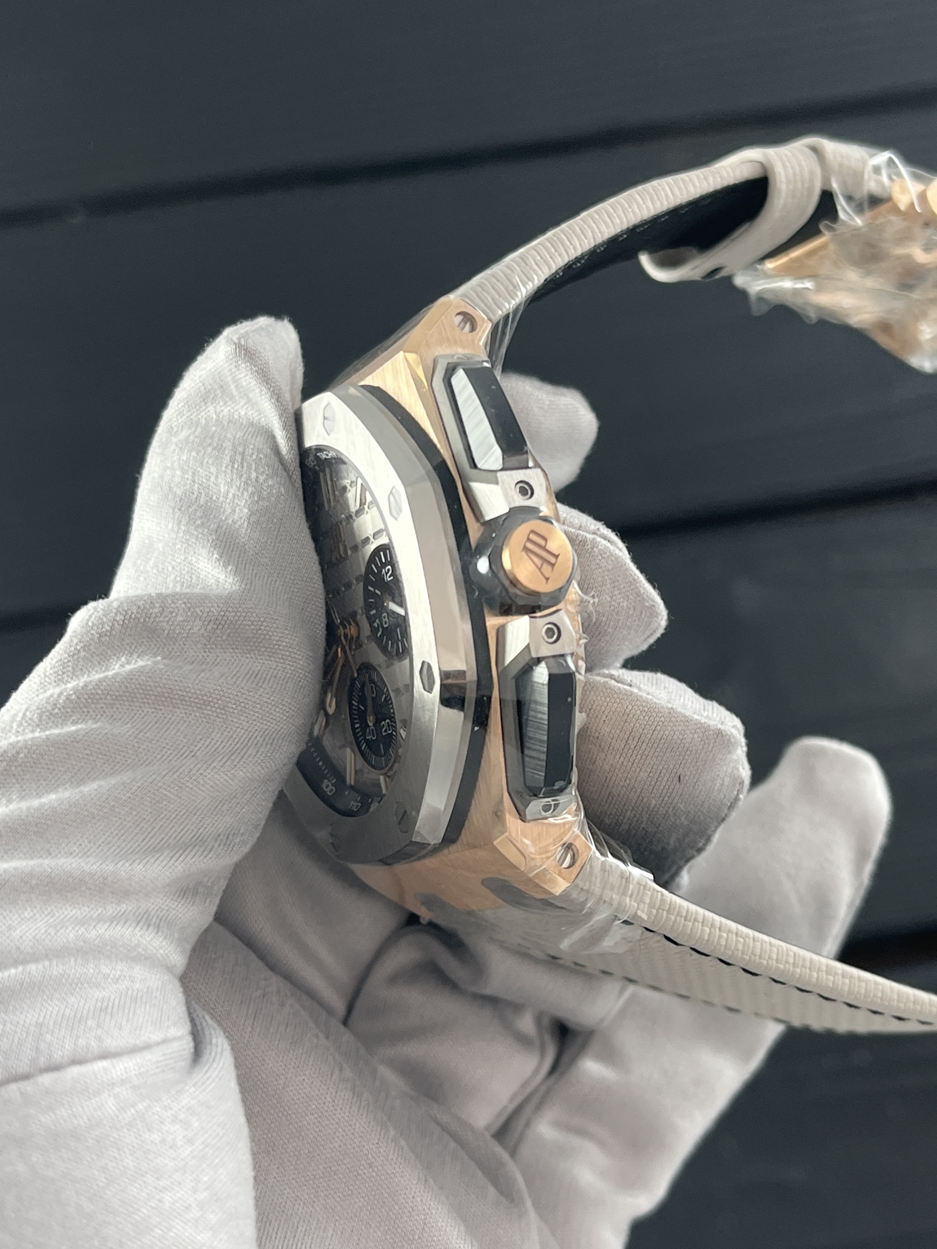 В мире часов и ювелирных изделий есть бренды, которые не нуждаются в представлении. Одним из таких именитых брендов является Audemars Piguet, известный своими изысканными и функциональными часами. Именно от этого бренда мы предлагаем вам уникальный и эксклюзивный экземпляр - Royal Oak Offshore Selfwinding Chronograph Pink gold Titanium bezel Grey Dial.