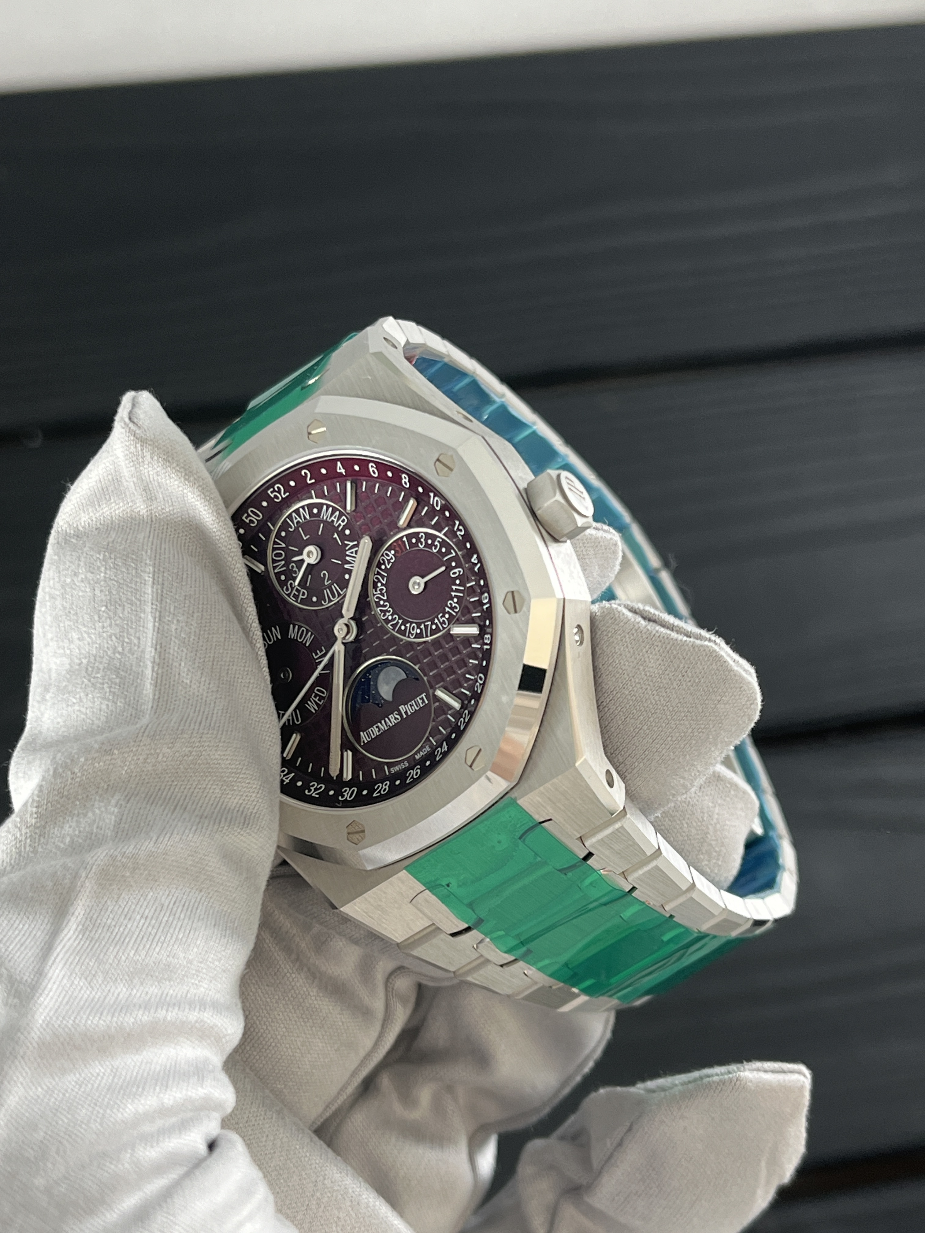 Каждые часы ROYAL OAK PERPETUAL CALENDAR 41MM White Gold Burgundy поставляются в оригинальной коробке и сопровождаются документами, подтверждающими их подлинность и качество. Мы гарантируем, что наши часы находятся в идеальном состоянии и прошли тщательную предпродажную подготовку.
