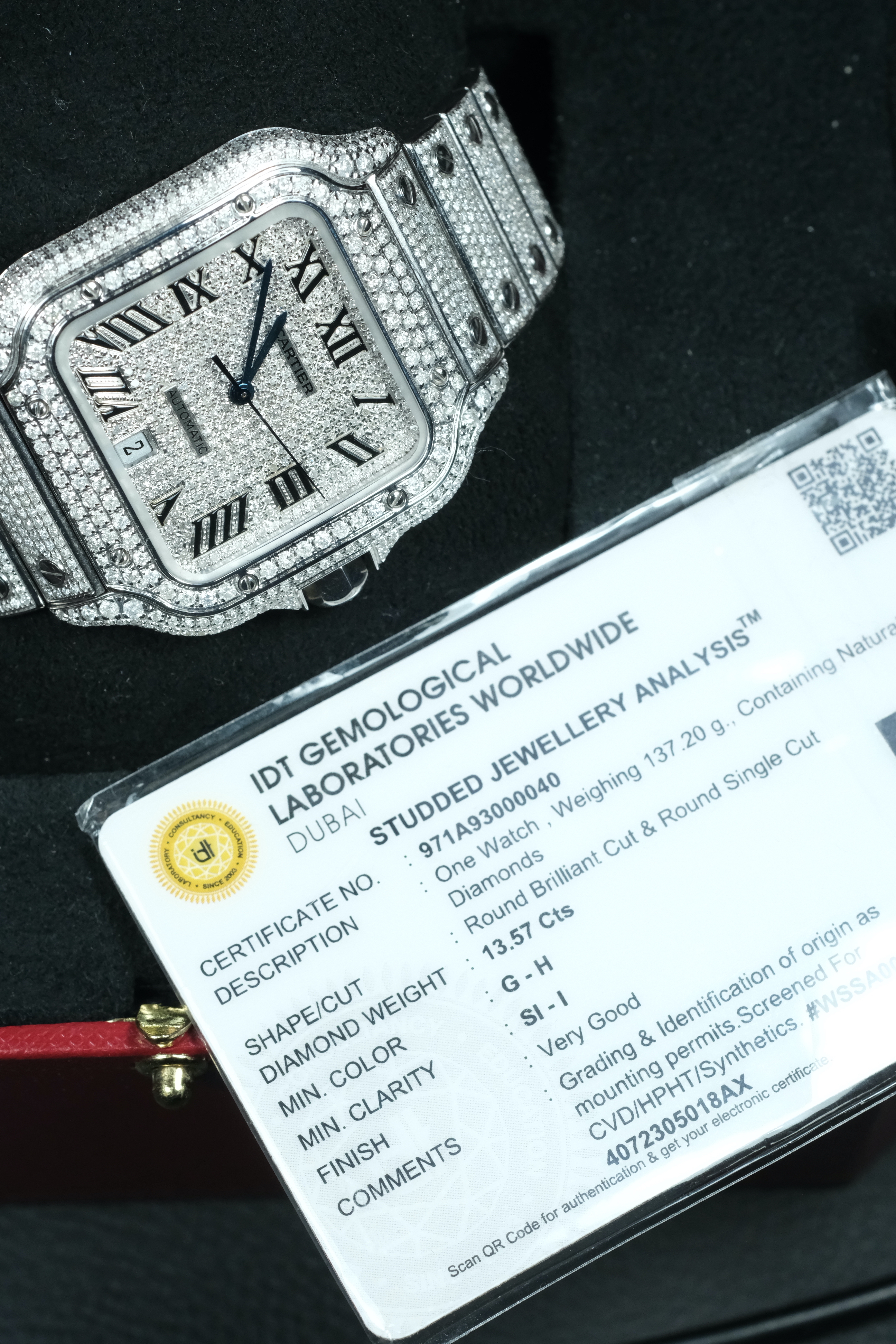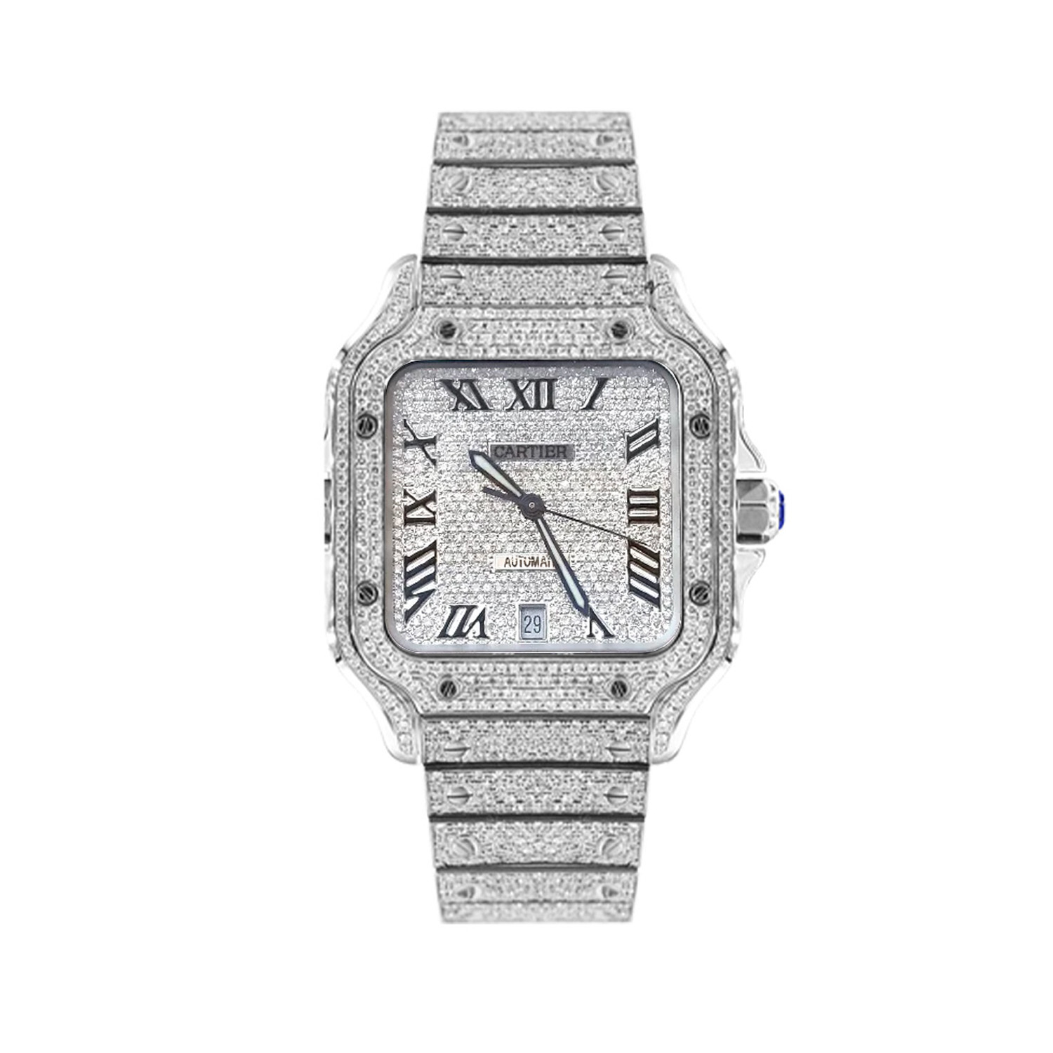 SANTOS DE CARTIER CUSTOM FULL PAVE DIAMOND оснащены функциями автоподзавода и индикации даты, что делает их не только красивыми, но и функциональными. Сапфировое стекло обеспечивает высокую степень защиты от царапин и повреждений, а водонепроницаемость на глубину до 100 метров делает их идеальными для активных людей, которые не боятся воды.