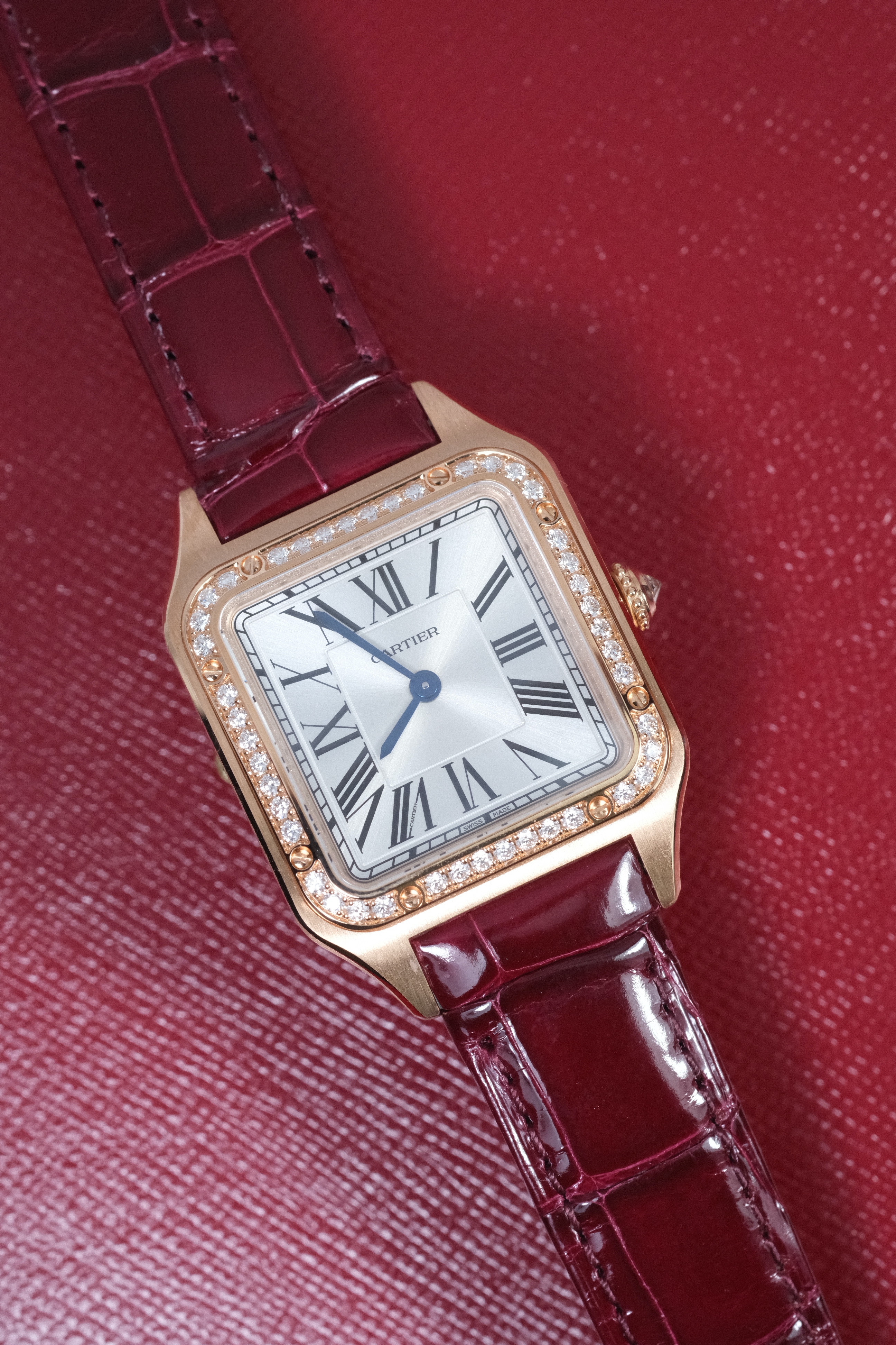 Корпус: Изготовлен из 18-каратного розового золота, что придает часам роскошный и изысканный вид. Форма корпуса квадратная с закругленными углами, что является характерной чертой модели Santos.