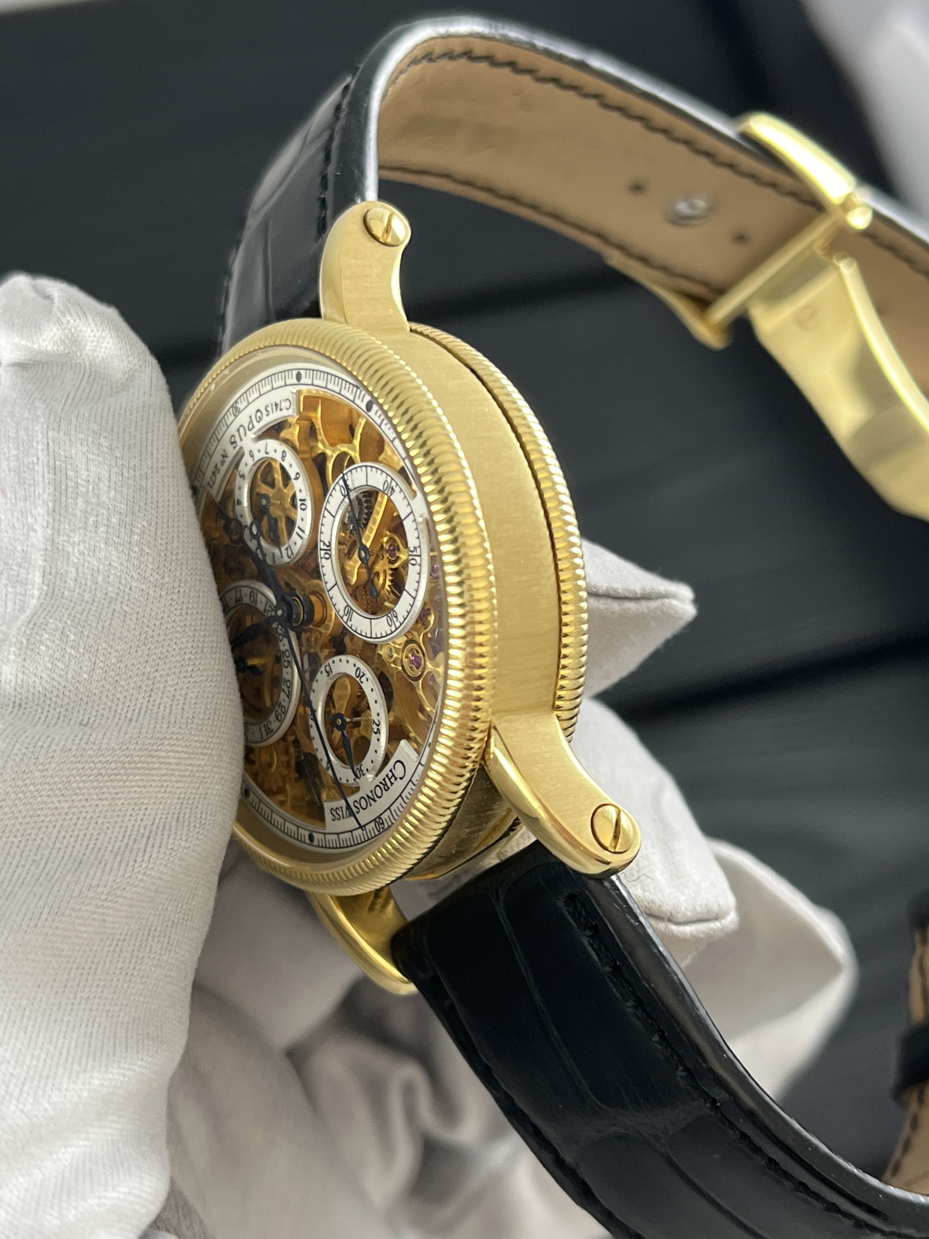 Каждая деталь часов, от сапфирового стекла до калибра C.741 S, говорит о том, что перед вами не просто часы, а настоящий шедевр. Именно поэтому часы SKELETONIZING OPUS SKELETON CHRONOGRAPH от Chronoswiss предлагаются в идеальном состоянии, с документами и гарантией на один год.