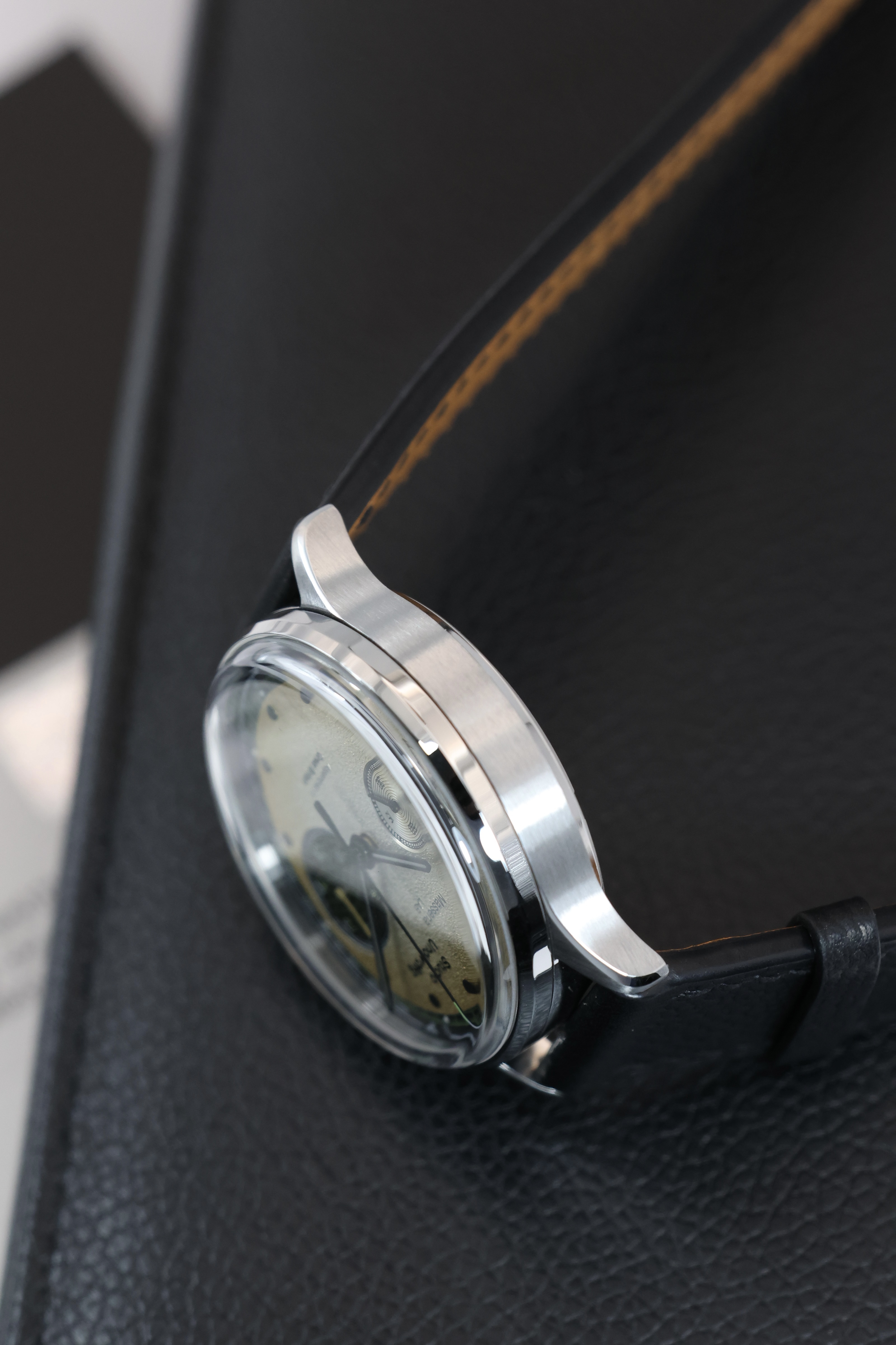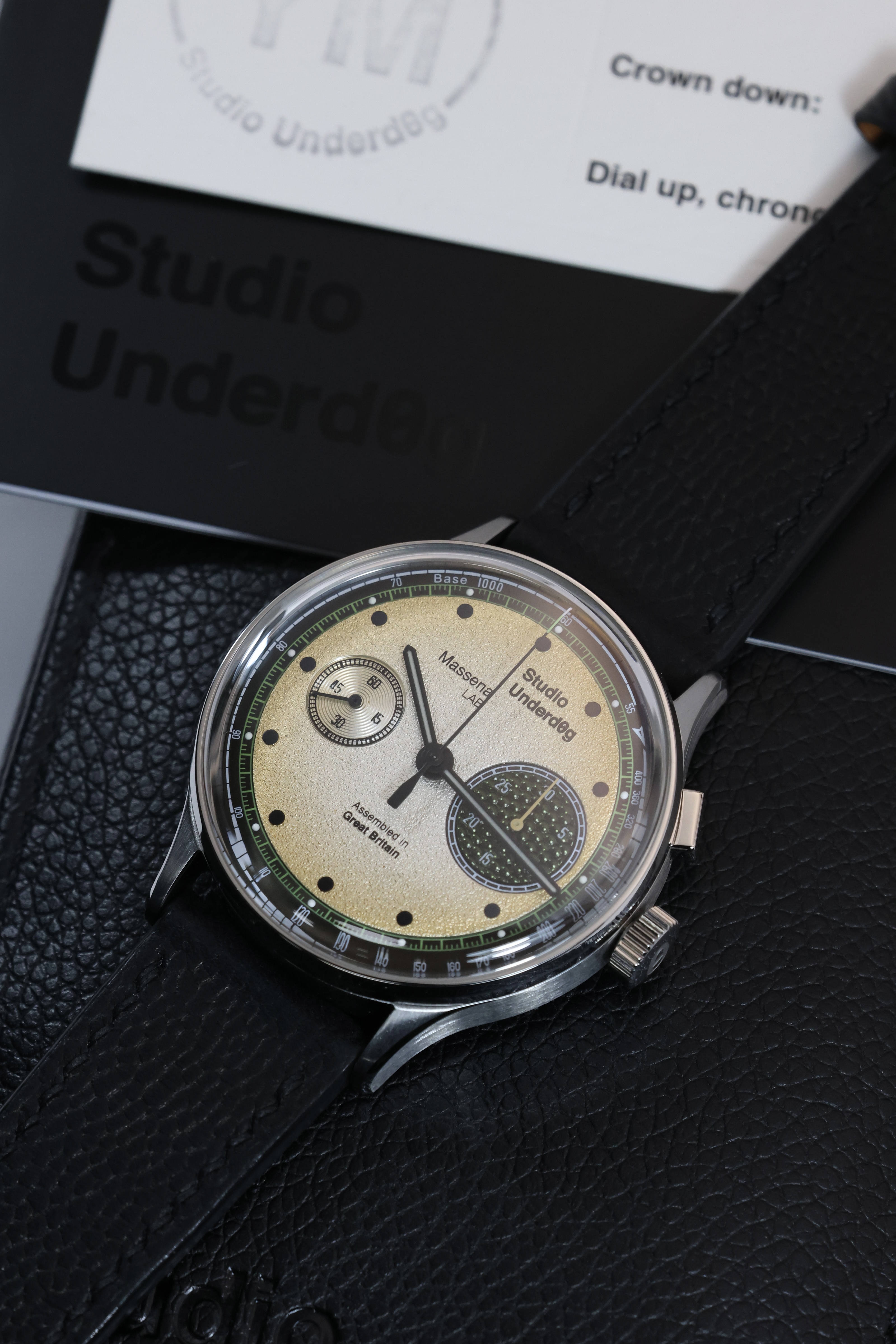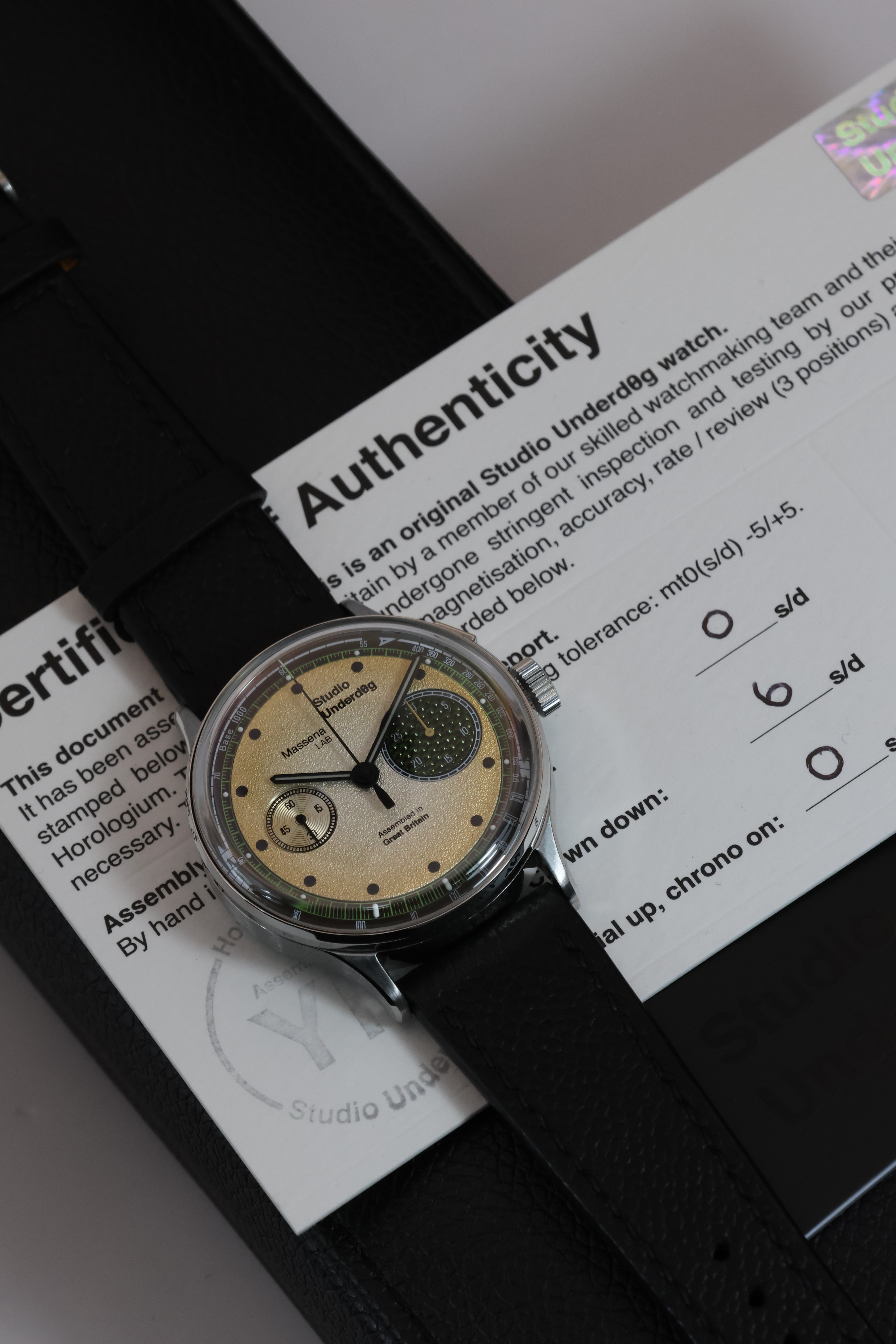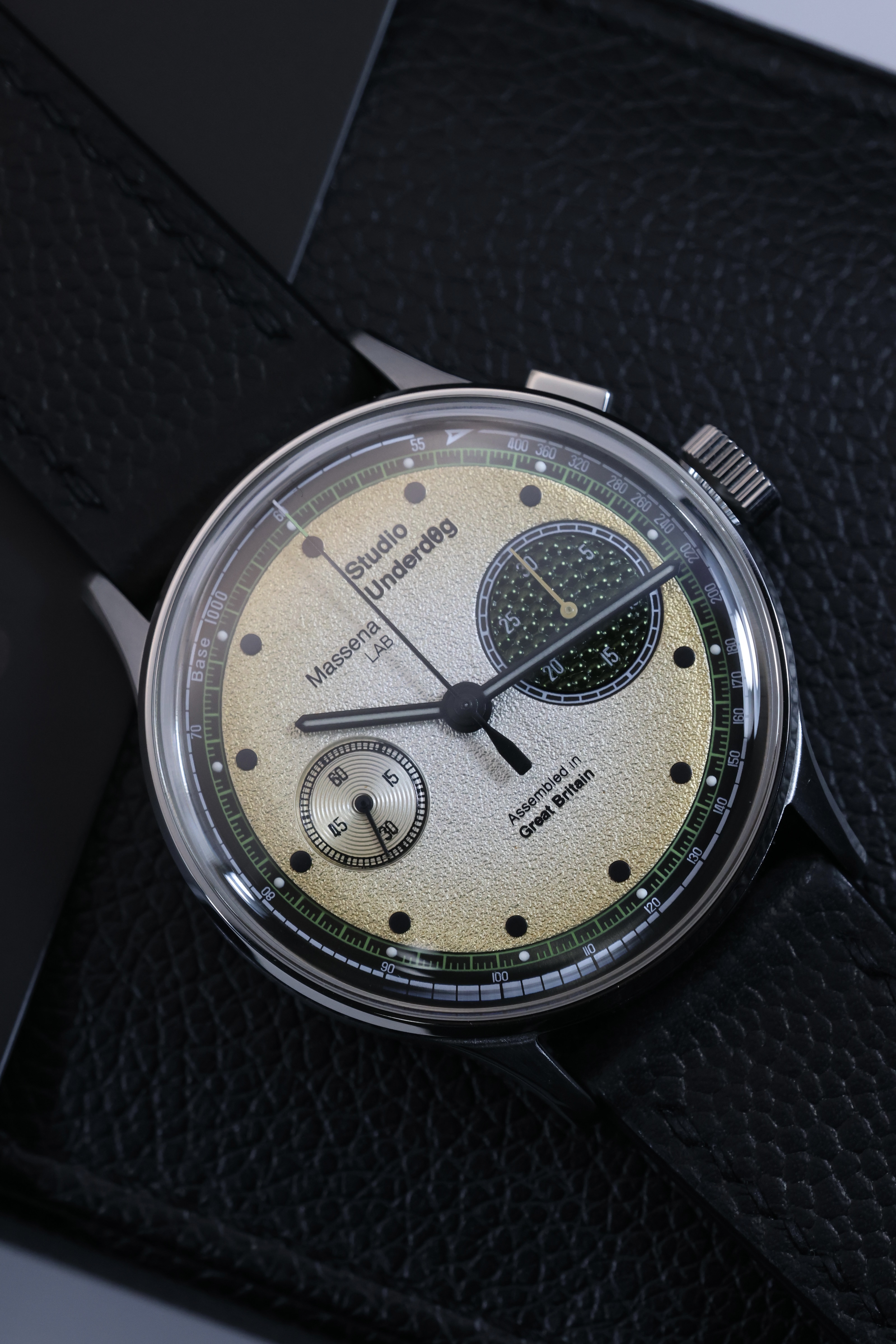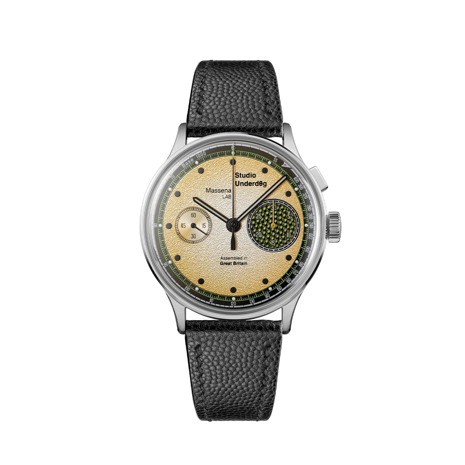 Часы Champagne & Caviar — это воплощение экстраординарного. Их дизайн сочетает тонкое мерцание оттенков шампанского с насыщенным чернильным цветом икры. Главной изюминкой стал увеличенный вспомогательный циферблат в положении «3 часа», который был переосмыслен так, чтобы напоминать икорницу. Эта деталь не только подчёркивает уникальность модели, но и добавляет игривости в её общий стиль. Центральная секундная стрелка хронографа также заслуживает внимания: её основание выполнено в форме бутылки шампанского, что является тонким намёком на изысканность и роскошь. Мерцающий циферблат цвета шампанского создаёт элегантный фон для этих деталей, а ремешок из телячьей кожи с текстурой гальки, созданный The Strap Tailor, завершает образ, добавляя часам утончённости и комфорта.