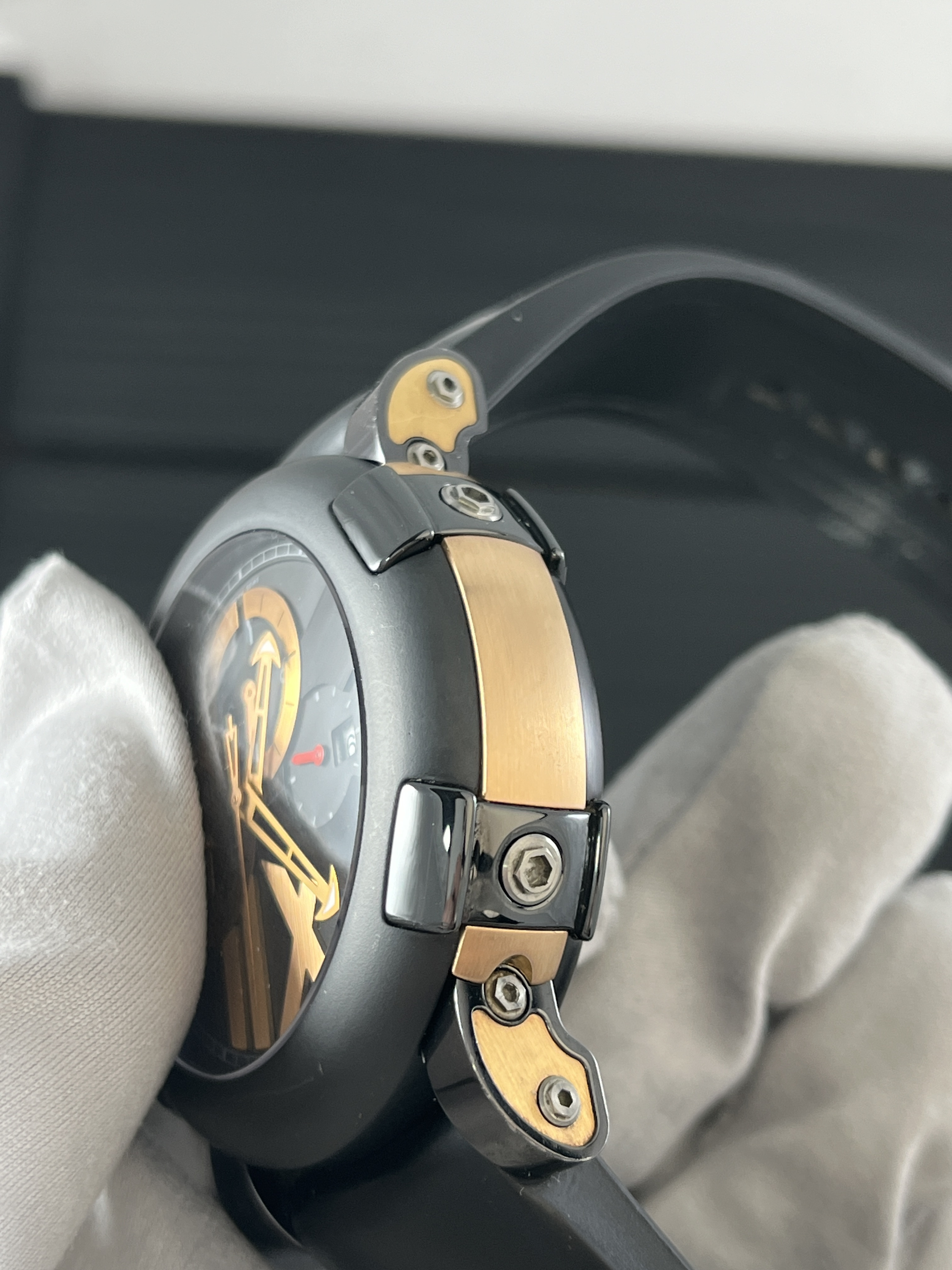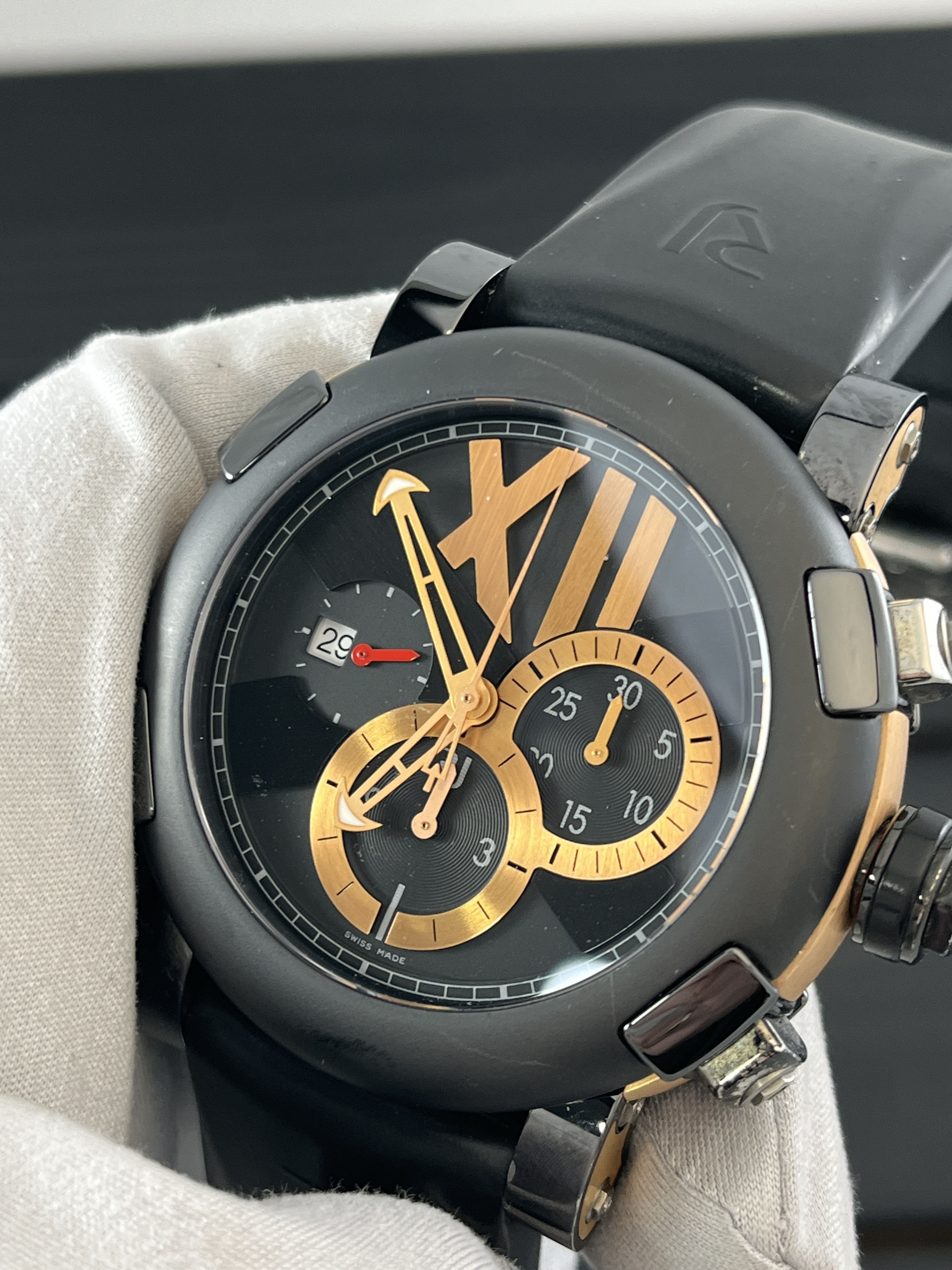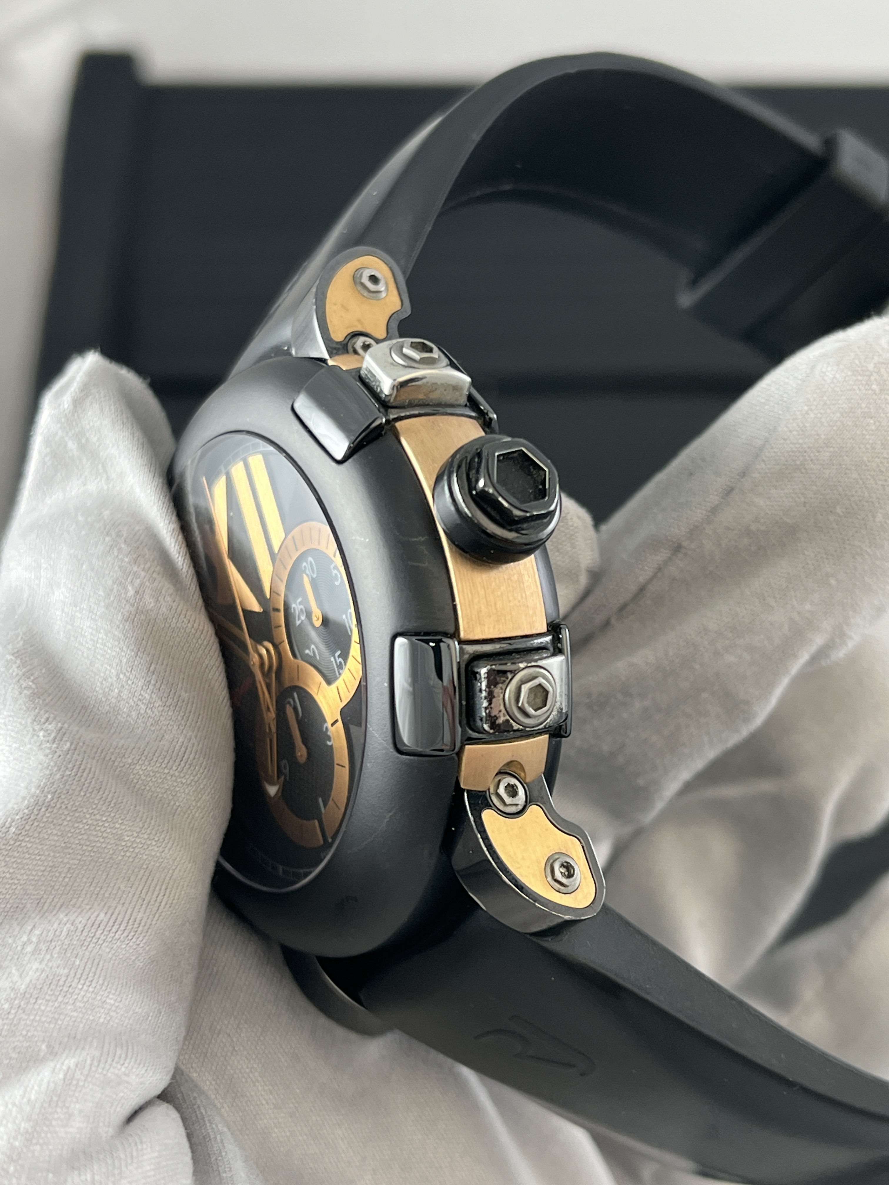 Созданные из стали и розового золота, корпус этих часов поражает своей изысканностью и прочностью. Размер 50 мм делает их заметными, но при этом не слишком громоздкими, что позволяет им идеально вписаться в любой образ. Ремешок из каучука обеспечивает комфортное ношение и добавляет спортивный штрих к общему дизайну.
