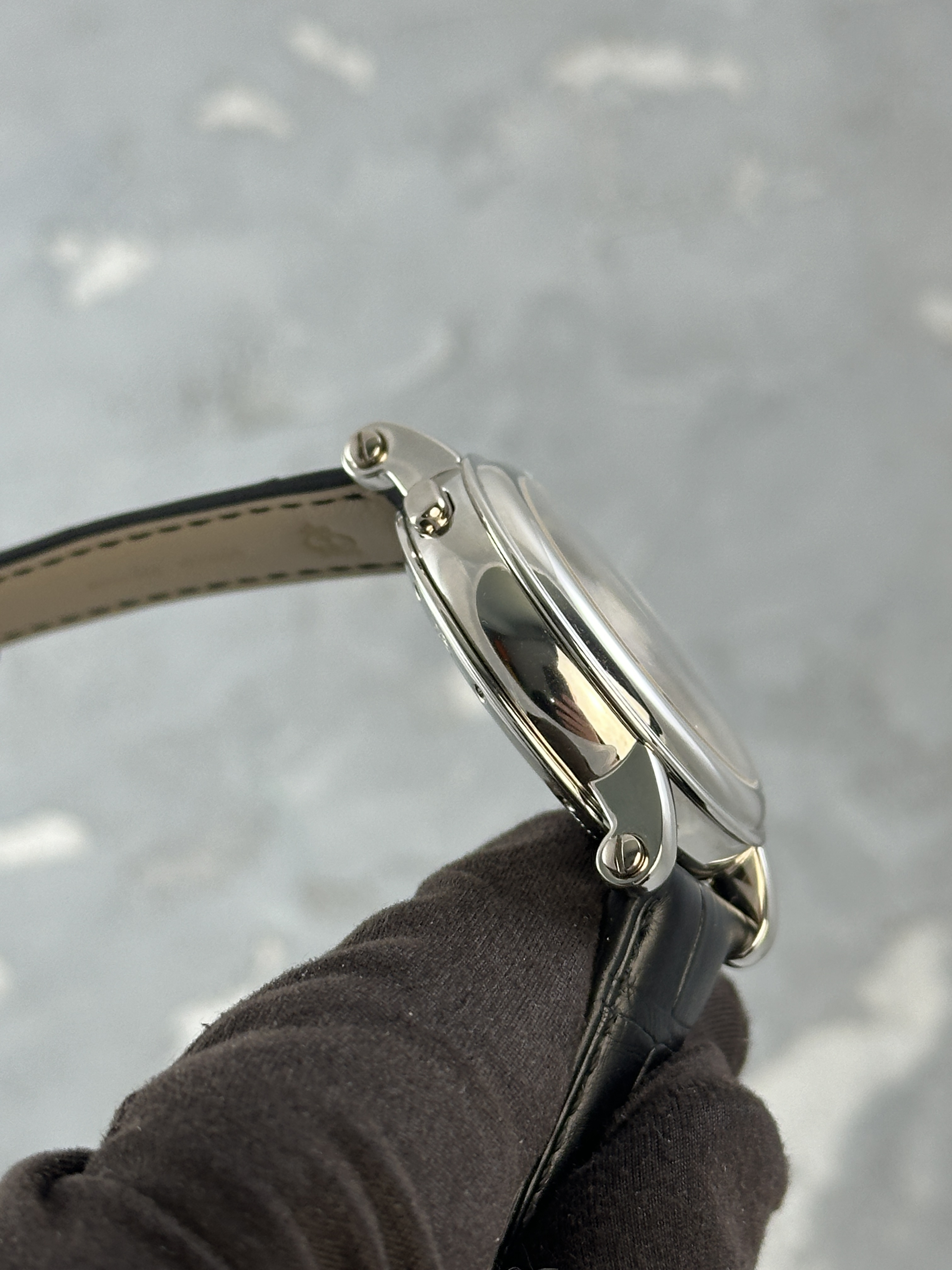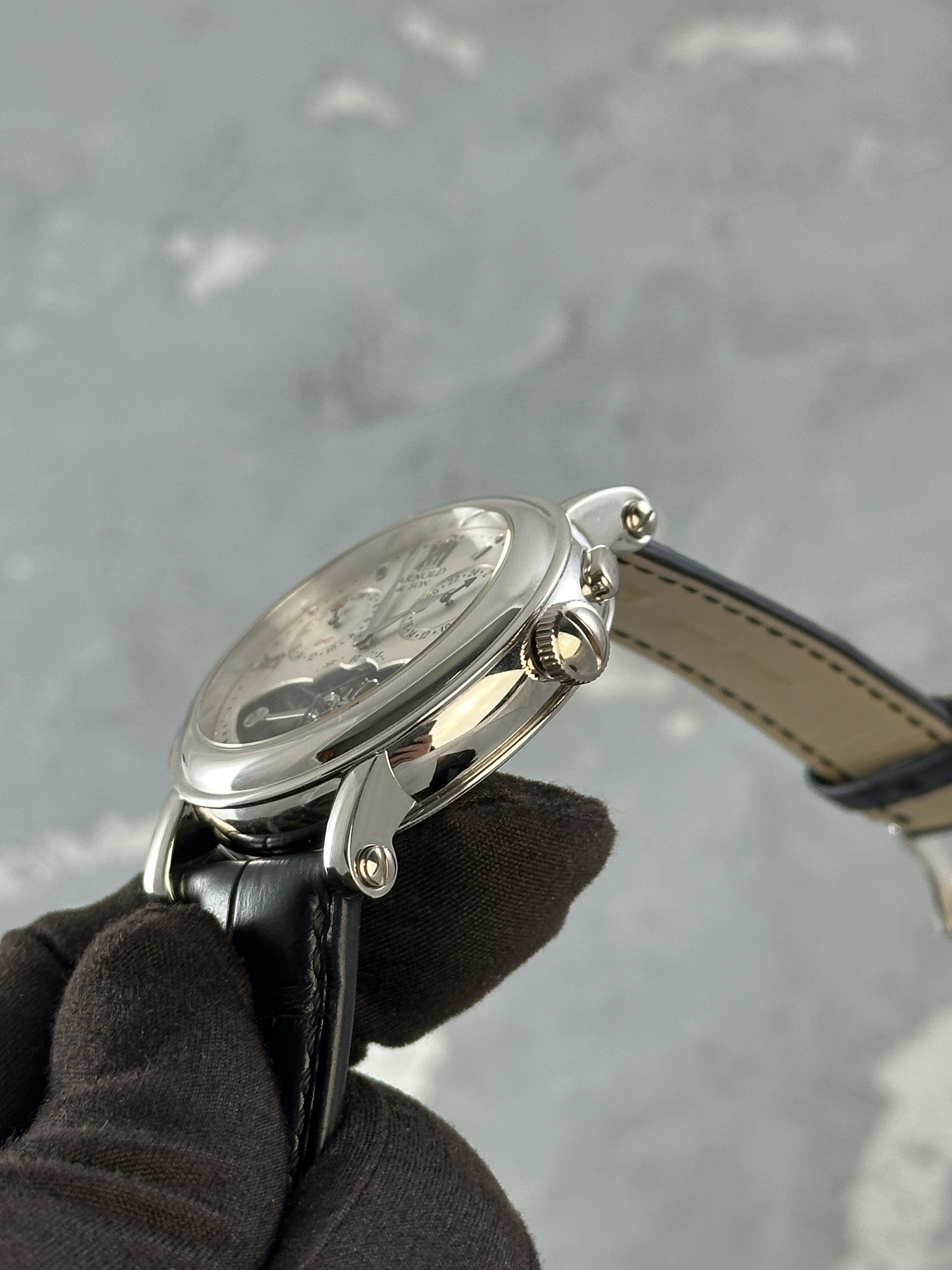 Корпус из благородной платины подчеркивает статус владельца, а кожаный ремешок обеспечивает комфорт и элегантность. Сапфировое стекло позволяет насладиться изысканными деталями механизма с ручным заводом, который является настоящим произведением искусства.