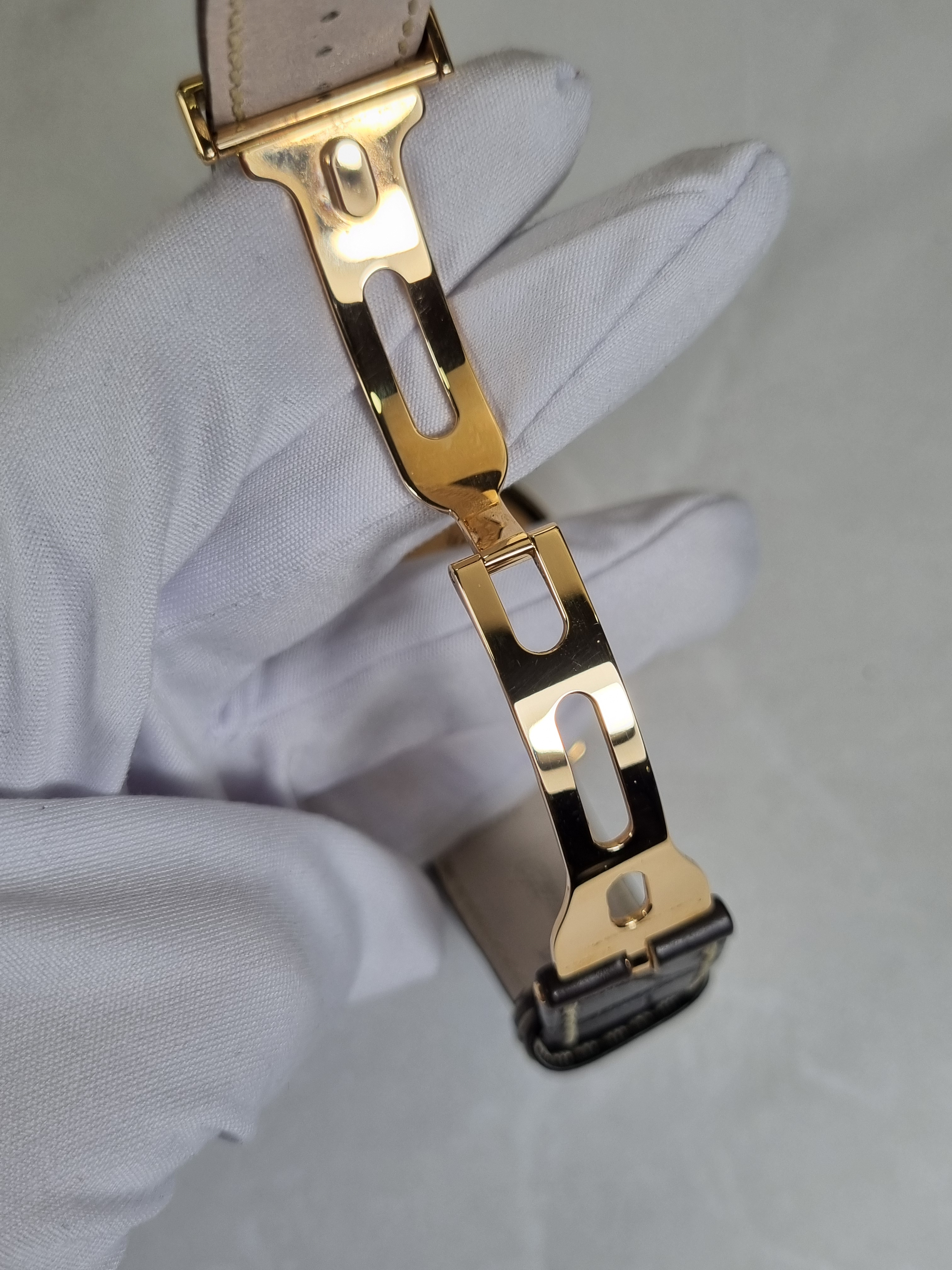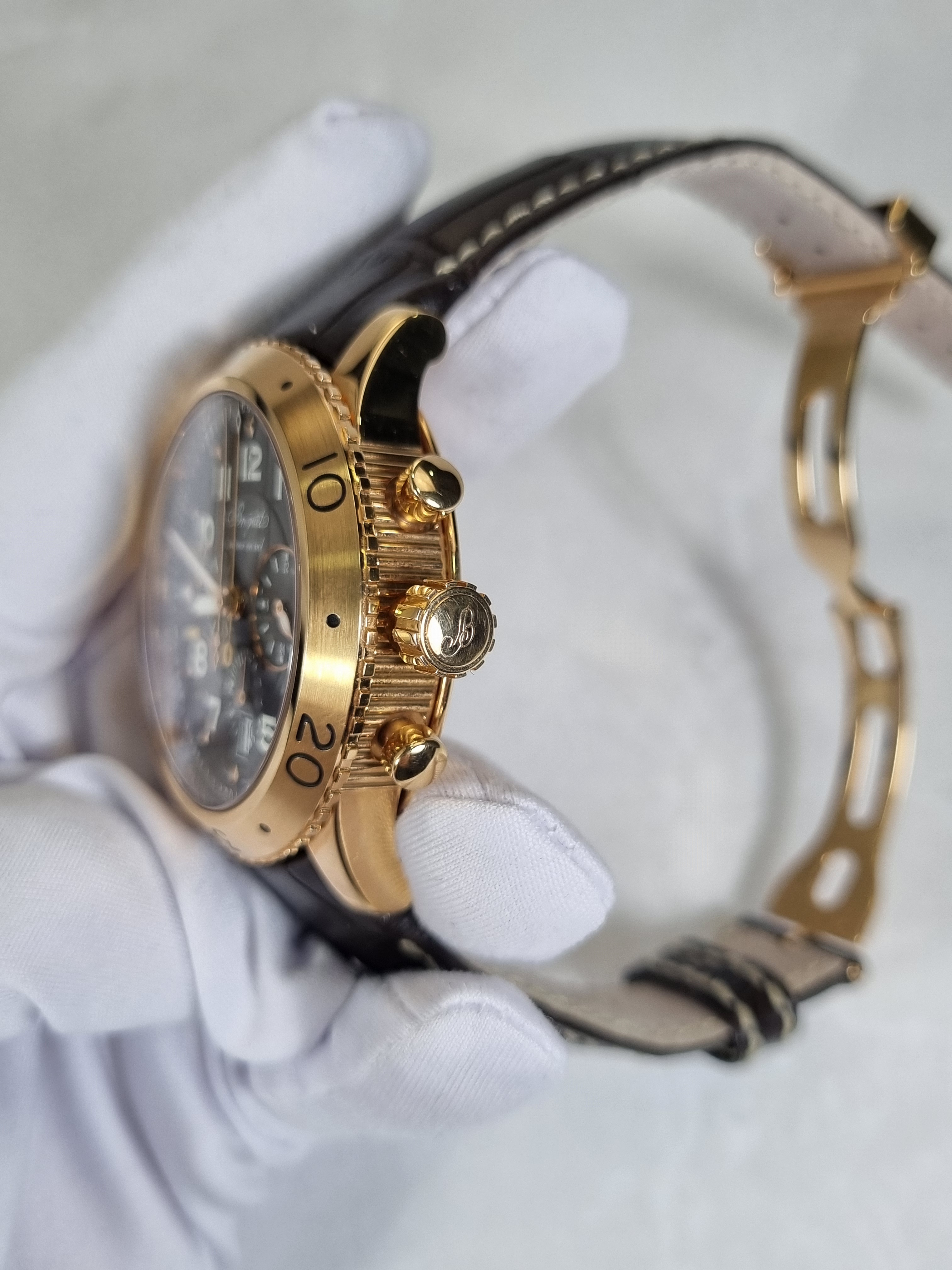 Сделанные из розового золота, эти часы выглядят роскошно и элегантно, а их размер 42,5 мм идеально подходит для мужской руки. Сапфировое стекло обеспечивает отличную видимость всех деталей механизма, а также защищает часы от повреждений. Кожаный ремешок добавляет изделию дополнительный шарм и комфорт в носке.