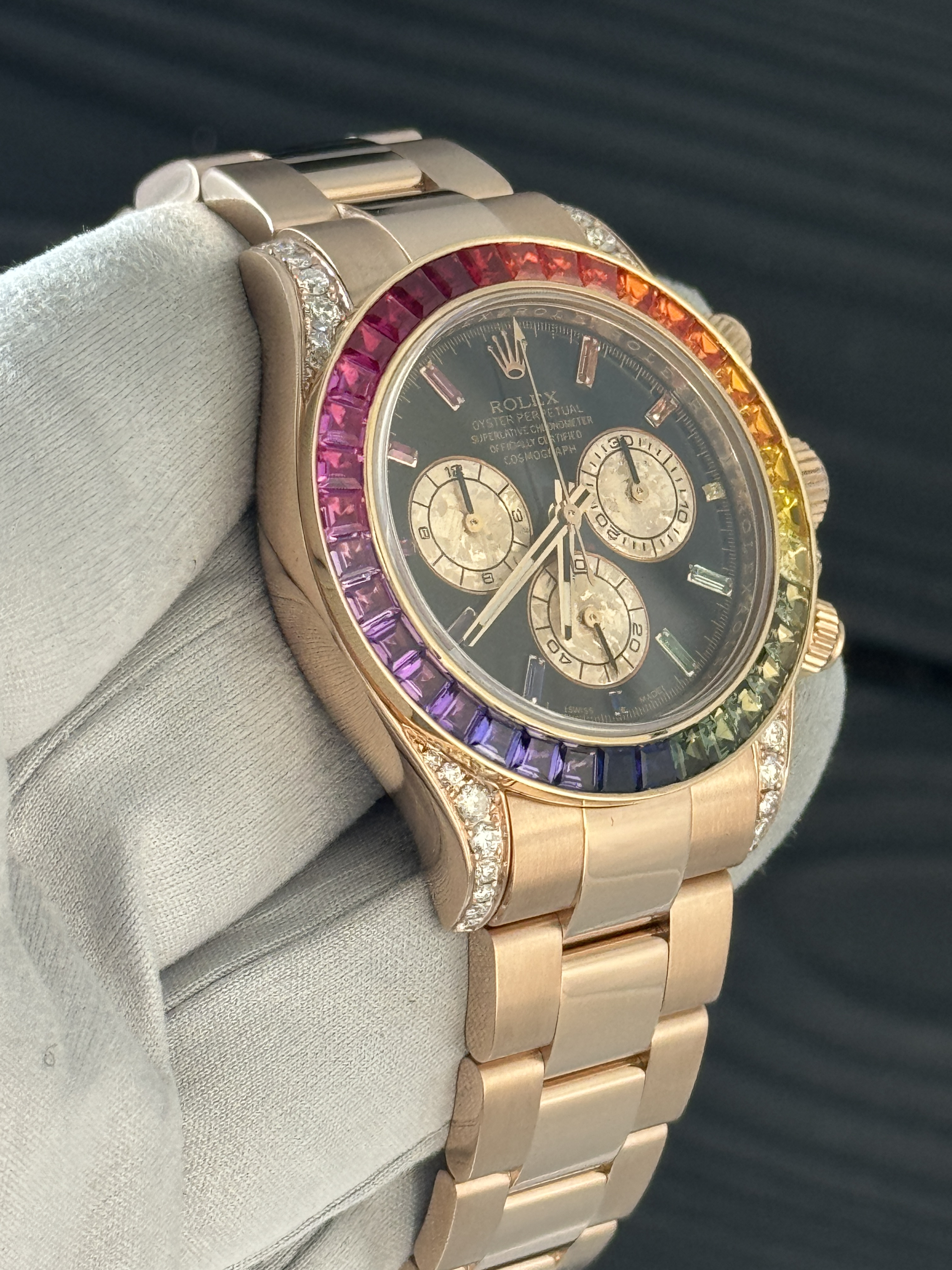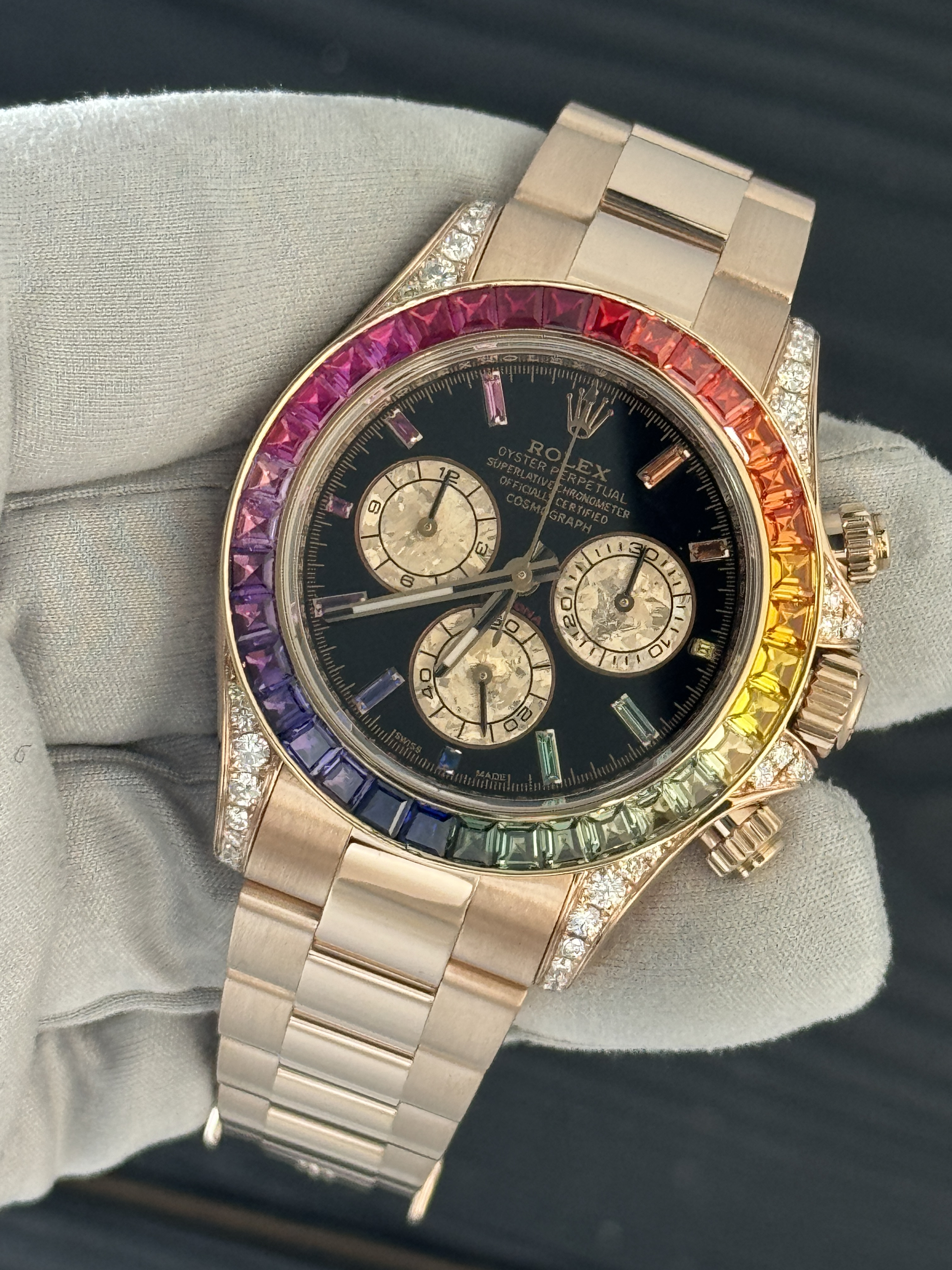 Таким образом, часы Тюнинг Oyster Perpetual Daytona Rose Gold Custom Rainbow от Rolex – это не просто аксессуар, а настоящий шедевр, который сочетает в себе изысканность, функциональность и надежность. Они идеально подойдут для тех, кто ценит уникальность и стремится к совершенству в каждой детали.